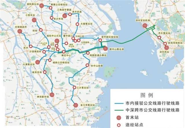据媒体公开报道,深中跨市公交预计规划建设南朗站、中山港、中山站、中山北站、博览中心站、富华站、城南客运站、小榄站、三乡站等枢纽站。