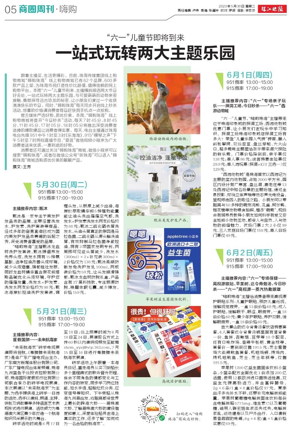 跟着主播买,生活更精彩。目前,珠海传媒集团线上购物商城“嗨购珠海” 线上购物商城已有62个品牌,600多款产品上架,为珠海市民打造性价比超值、值得信赖的网上购物平台。本周“六一”儿童节到来,主播精挑细选两大节日好去处,一站式玩转两大主题乐园,与可爱萌萌的动物亲密接触,勇敢探寻远古恐龙的秘密,让小朋友们度过一个收获满满快乐的节日。同时,“嗨购珠海”每天同步开启线上秒杀活动,惊喜的价格请消费者每日赶快用手机点一点抢购。