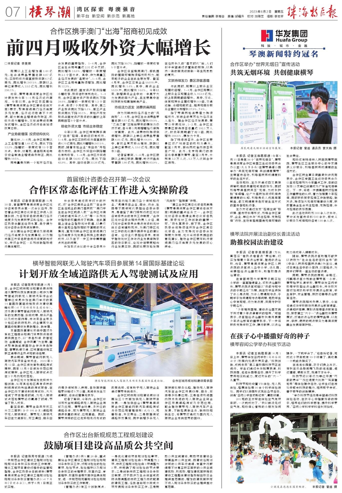 近日,横琴粤澳深度合作区统计局发布今年1-4月经济运行简况。今年以来,合作区紧密围绕《横琴粤澳深度合作区建设总体方案》要求,聚焦促进澳门经济适度多元发展,经济运行取得不少成绩,部分制造业增速由负转正,吸收外资大幅增长,文旅消费迎来爆发式增长,全区经济运行总体延续恢复态势。