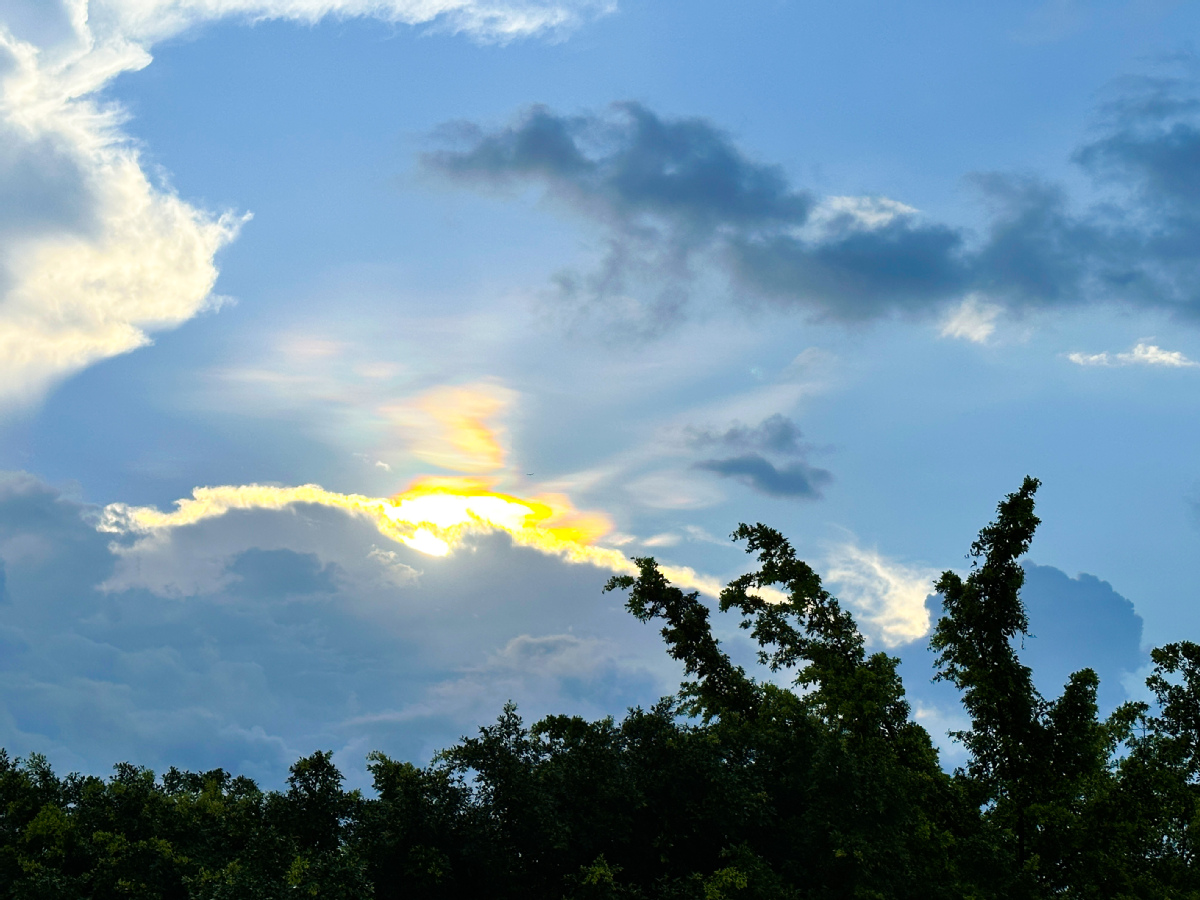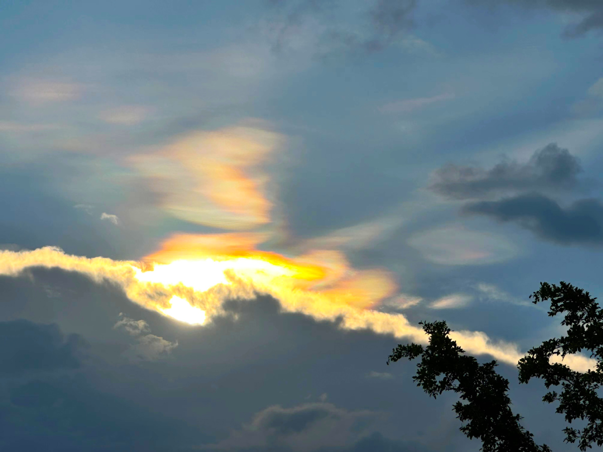 “七彩祥云”是指太阳光线与云彩中的冰晶结构产生的自然现象,是典型的“日华”现象。在合适的天气状况下,太阳光正好和云构成一个合适的角度,太阳光通过云彩时,通过折射和反射作用,上空云彩内的水汽将太阳光谱分离,从而散射出七色光芒。