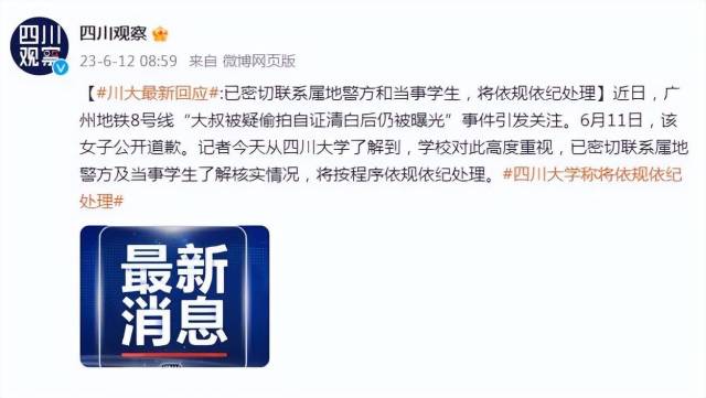 近日,广州地铁8号线“大叔被疑偷拍自证清白后仍被曝光”事件引发关注。6月11日,该女子公开道歉。记者今天从四川大学了解到,学校对此高度重视,已密切联系属地警方及当事学生了解核实情况,将按程序依规依纪处理。