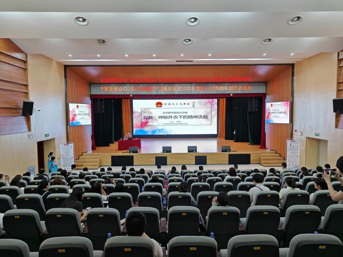 为提升辖区广大教师群体反邪教警示教育工作质量,净化校园环境,创建无邪校园,6月12日下午,珠海高新区综治局联合区社会事业局、市公安局高新分局在高新区市民艺术中心开展“聚反邪众心,筑平安校园”珠海高新区2023年教职工反邪教专题培训活动。