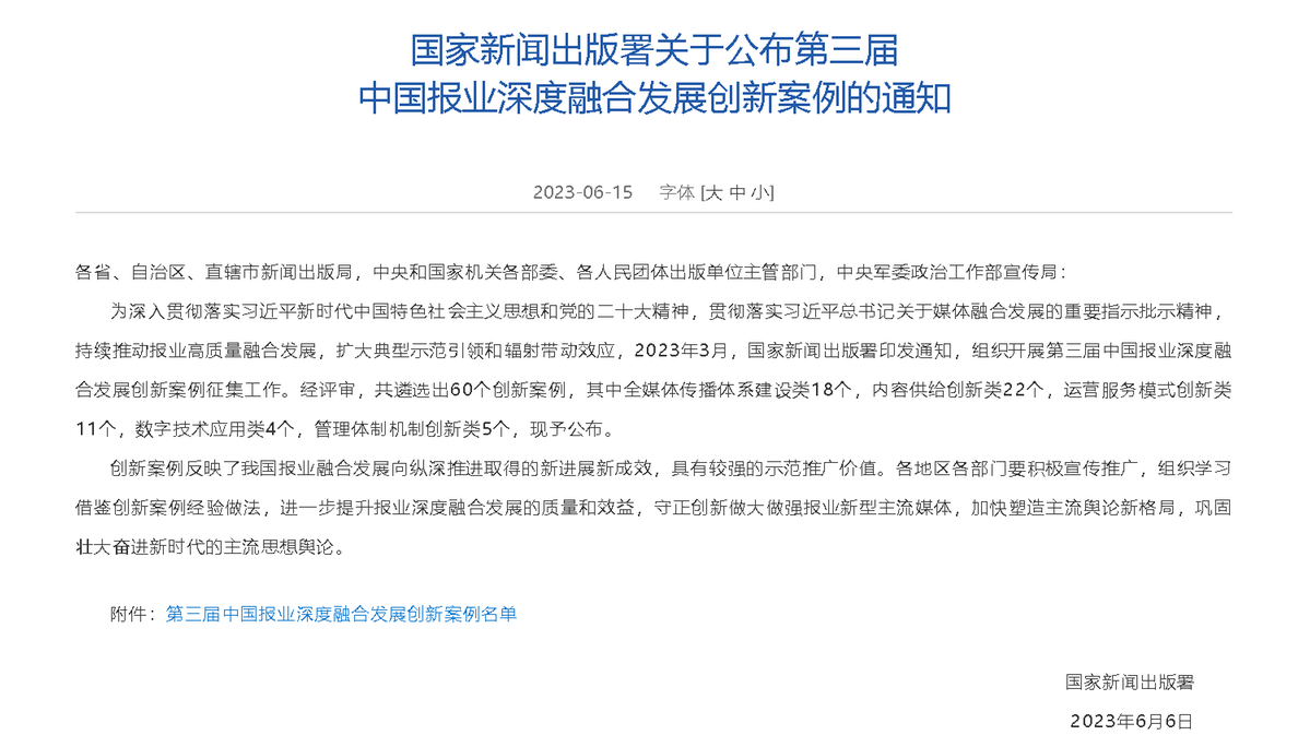 据国家新闻出版署介绍,此次评审共遴选出60个创新案例,其中全媒体传播体系建设类18个,内容供给创新类22个,运营服务模式创新类11个,数字技术应用类4个,管理体制机制创新类5个。创新案例反映了我国报业融合发展向纵深推进取得的新进展新成效,具有较强的示范推广价值。