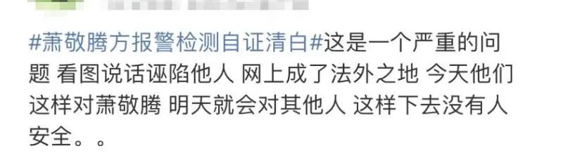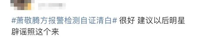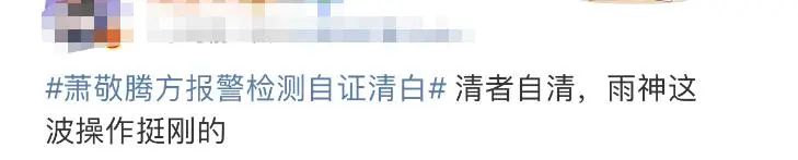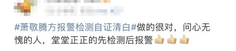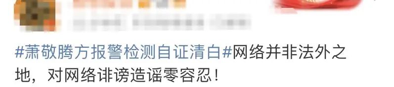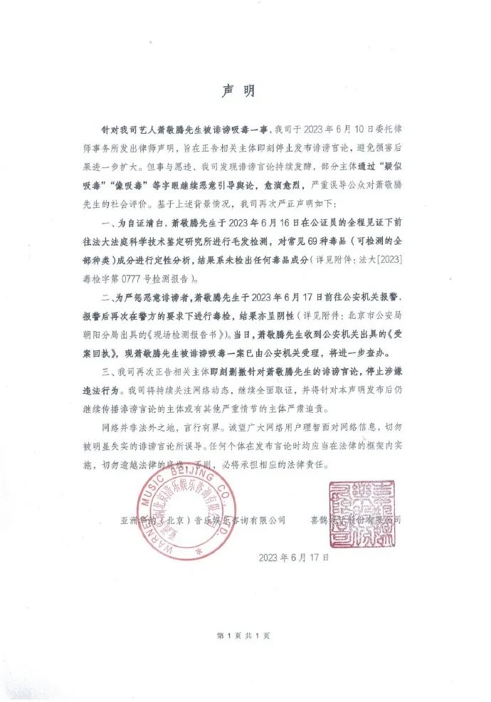 我司艺人萧敬腾先生坚决遵守国家法律法规,严于律己。网络并非法外之地,我司对网络诽谤造谣零容忍!诽谤事件发生后,我司及时联系权威检测机构进行毛发检测,结果显示未检出任何毒品成分,并在与律师团队商议后,决定做报警处理,希望这场网络诽谤就此终止,也希望大家可以共同维护网络环境健康良好发展,坚决抵制造谣诽谤行为!