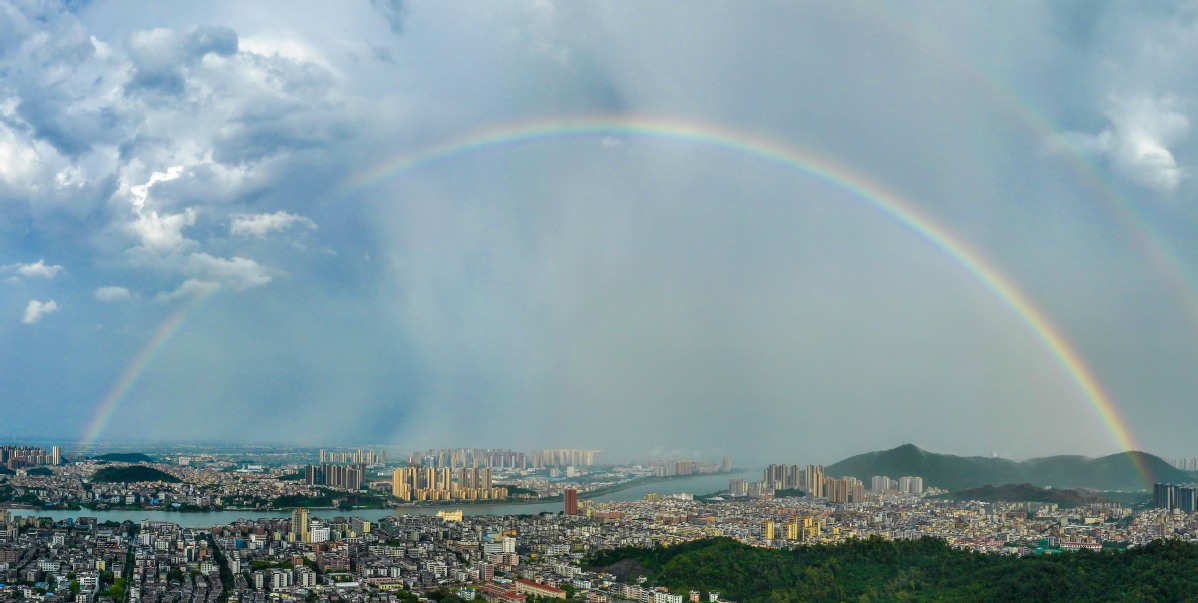 近日,一场降雨过后,珠海市斗门区上空部分地区出现迷人的双彩虹,吸引不少市民驻足观赏、拍照。