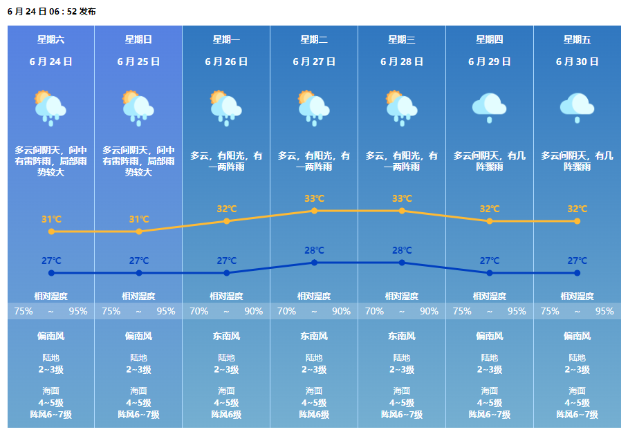 珠海市气象台6月24日10时00分发布信息:影响我市的雷雨云团已减弱,市气象台已解除全市雷雨大风预警信号。预计今天我市多云,部分时间有阳光,间中有雷阵雨,气温27-31℃。