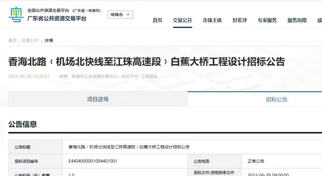 日前,珠海市公共资源交易中心发布《香海北路(机场北快线至江珠高速段)白蕉大桥工程设计招标公告》(以下简称公告),一座横跨黄杨河,连接东西两岸的新跨河大桥,离开工建设又近一步。