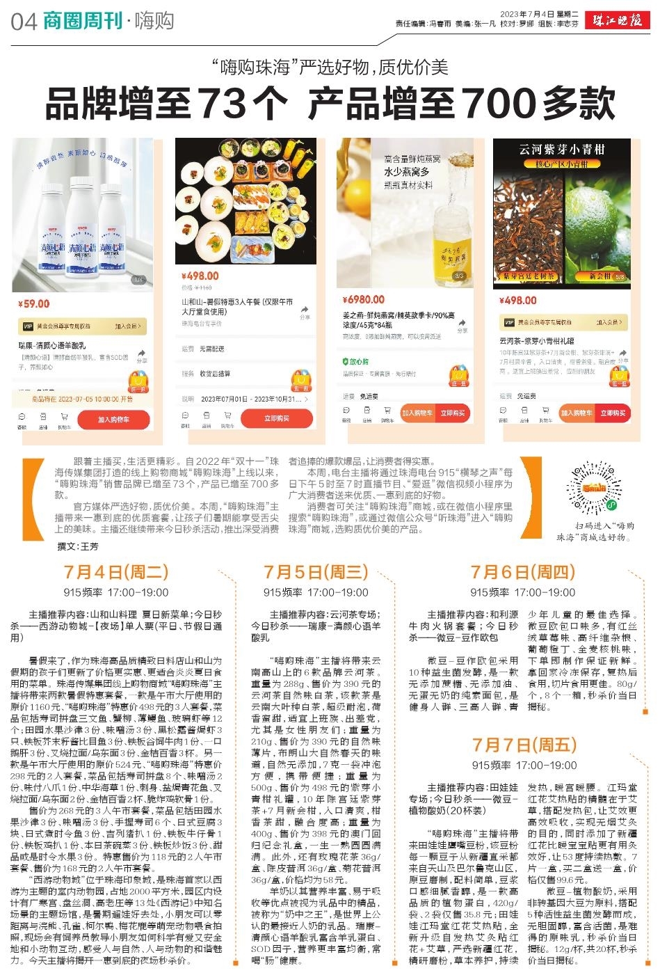 跟着主播买,生活更精彩。自2022年“双十一”珠海传媒集团打造的线上购物商城“嗨购珠海”上线以来,“嗨购珠海”销售品牌已增至73个,产品已增至700多款。