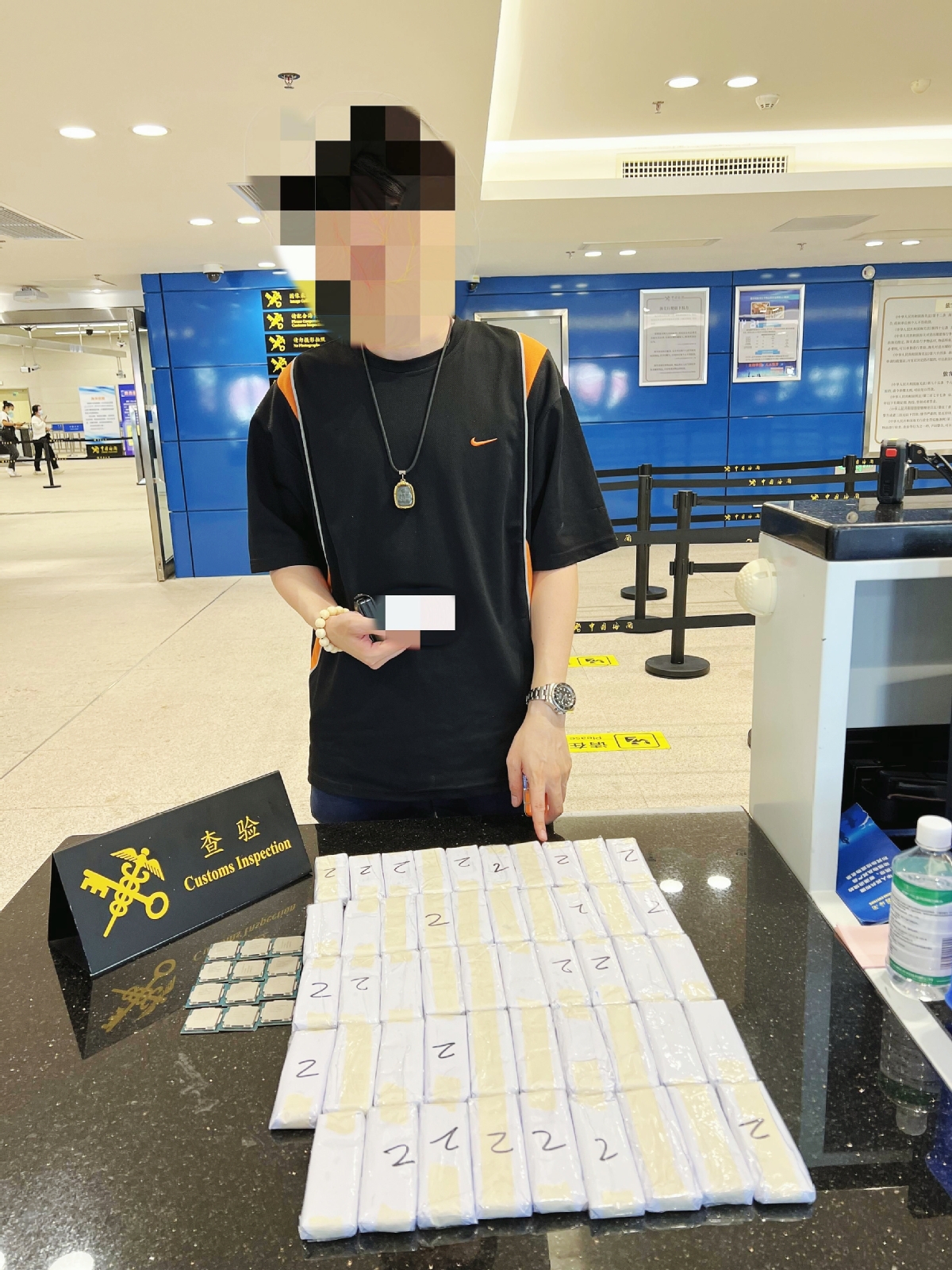 6月29日16时许,一名身穿黑色短袖的旅客从青茂口岸旅检现场“无申报通道”进境,现场关员仔细观察后发现该名旅客走路时的姿势明显异常,遂对其进行拦截。