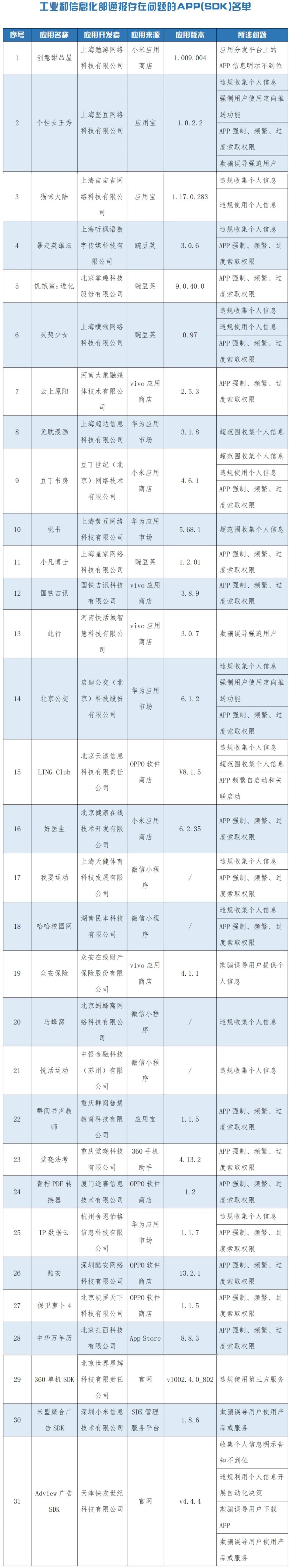 工业和信息化部高度重视用户权益保护工作,依据《个人信息保护法》《网络安全法》《电信条例》《电信和互联网用户个人信息保护规定》等法律法规,持续开展APP侵害用户权益专项整治行动。近期,我部组织第三方检测机构对群众关注的休闲娱乐、实用工具、出行服务等移动互联网应用程序(APP)及第三方软件开发工具包(SDK)进行检查。发现31款APP(SDK)存在侵害用户权益行为(详见附件),现予以通报。