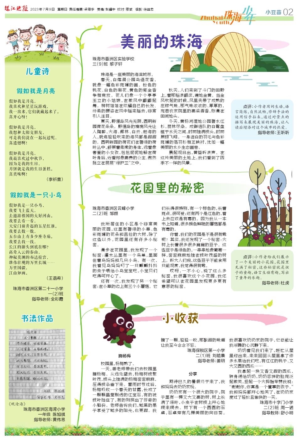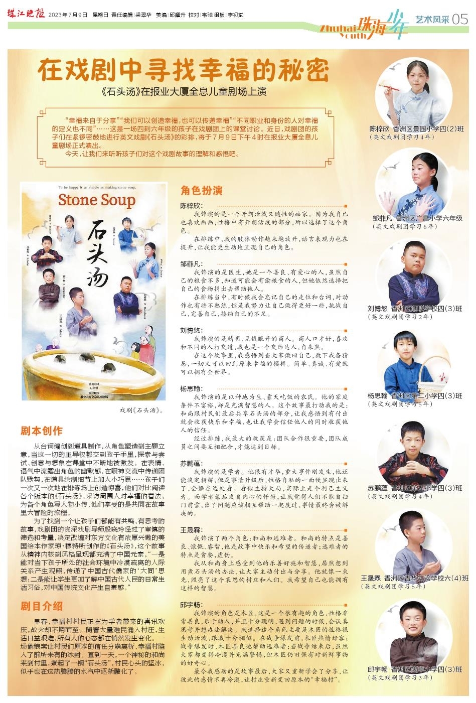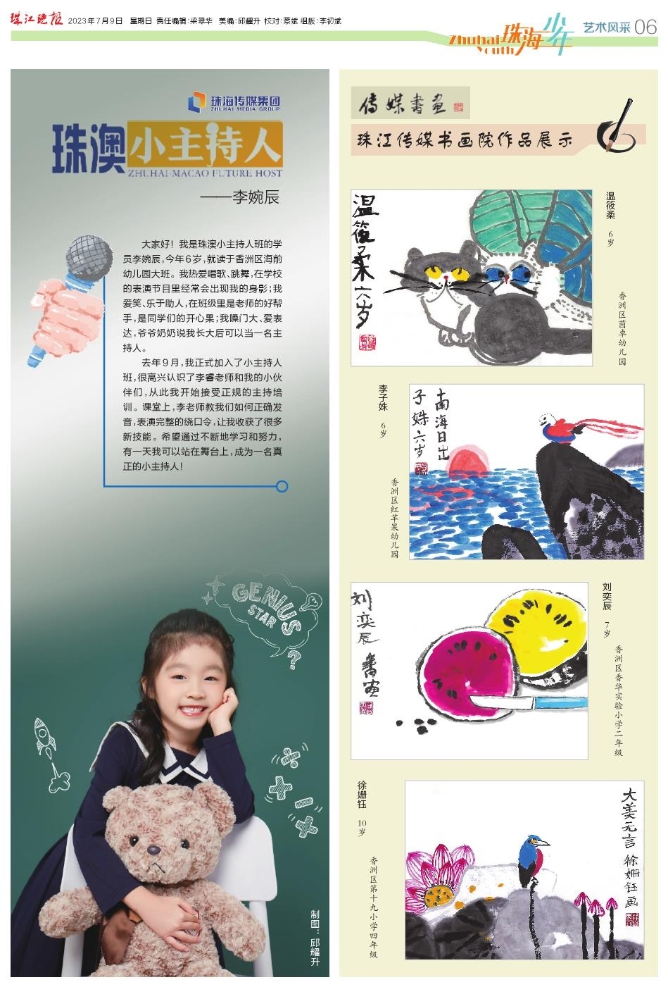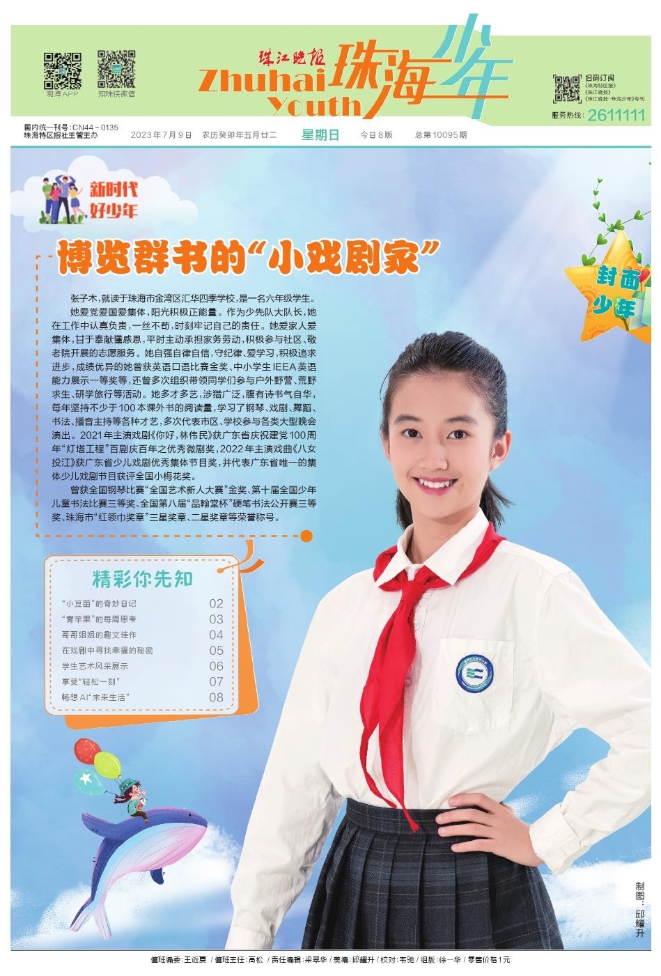 《珠海少年》是一份以孩子视角看世界的新闻纸,让小读者变身小记者;这里有一片让孩子爱上写作的文学天地;这里还是一个活跃思维、展示才艺的共乐园。《珠海少年》每周在珠江晚报出版,每期刊发8个版。