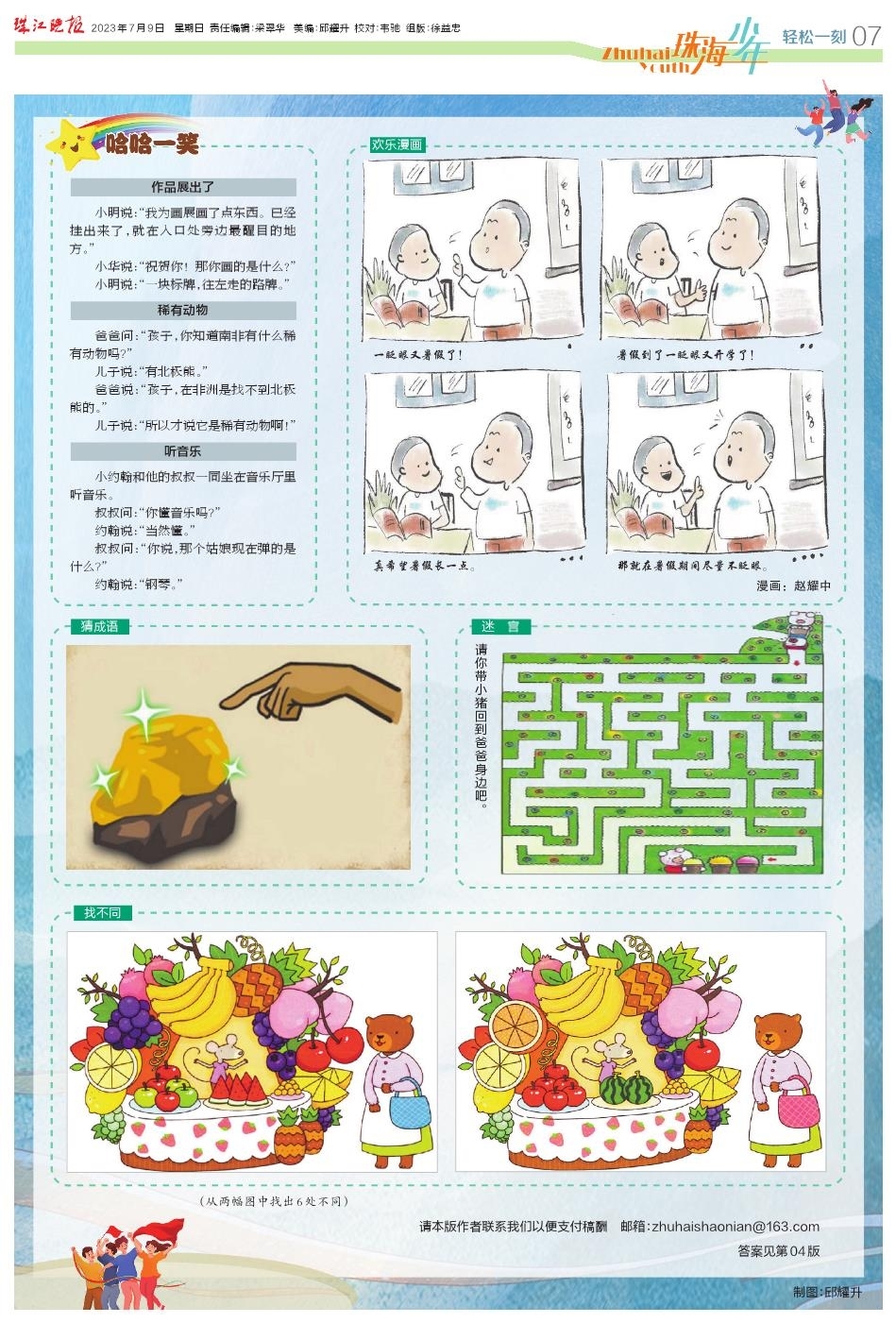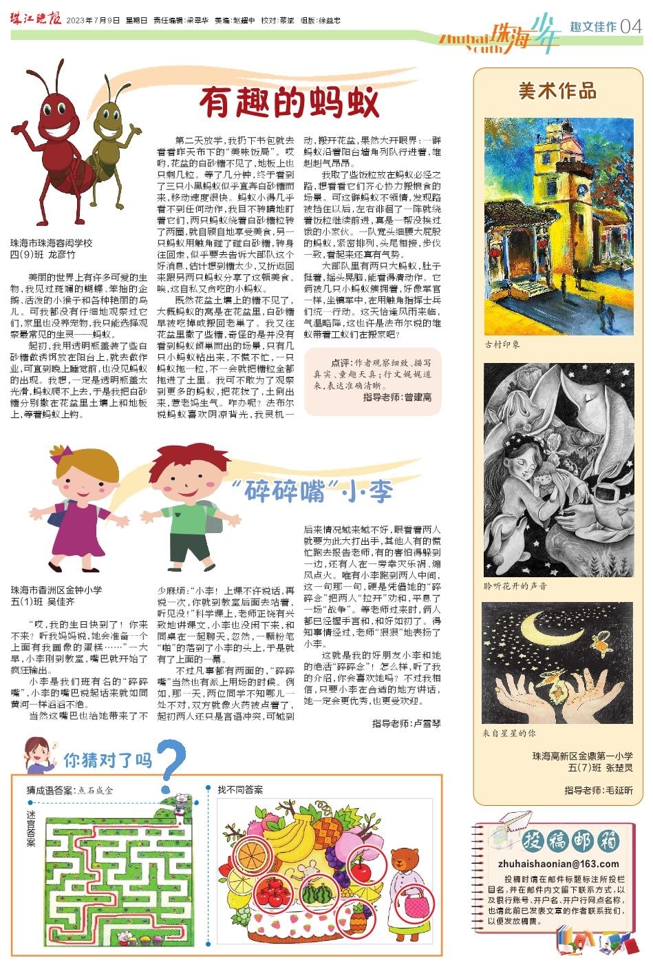 《珠海少年》每周日在珠江晚报出版,设有“每周一星”“小豆苗”“青苹果”“趣文佳作”等多个精彩栏目。欢迎小读者们变身小记者踊跃投稿,在《珠海少年》上刊登优秀作文、绘画作品,留下参加各类比赛、活动的身影……让《珠海少年》成为少年儿童健康快乐成长的励志周刊、益智读物、知心朋友。