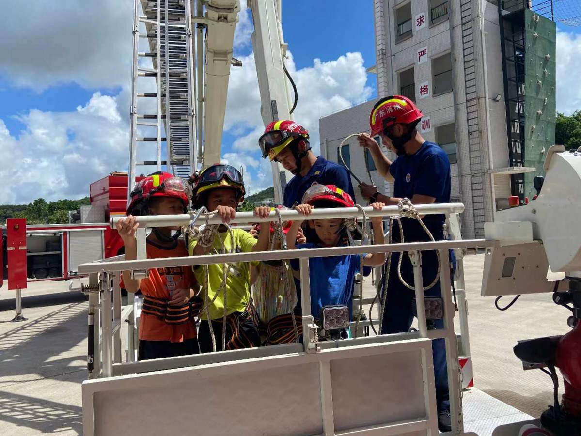 讲解完毕后,消防指战员带领孩子们登上了在救援现场经常能使用到的“云梯”,感受消防员在云梯上“扑火救人”的场景。