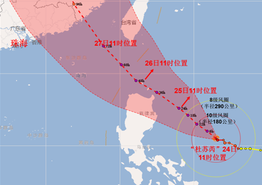据珠海市气象台最新消息,“杜苏芮”已加强为强台风级,预计其将西北行,强度继续加强,最强可达超强台风级(16-17级),将于26日进入巴士海峡,之后较大可能于27日从台湾岛南部沿海登陆或擦过,然后趋向福建中南部和粤东沿海。受“杜苏芮”和副热带高压的共同影响,25-27日我市以高温酷热天气为主,局部有雷雨和短时大风,28-29日有骤雨。