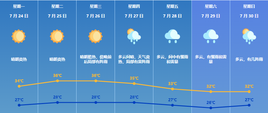 25日:晴朗酷热,气温28-36°C;
