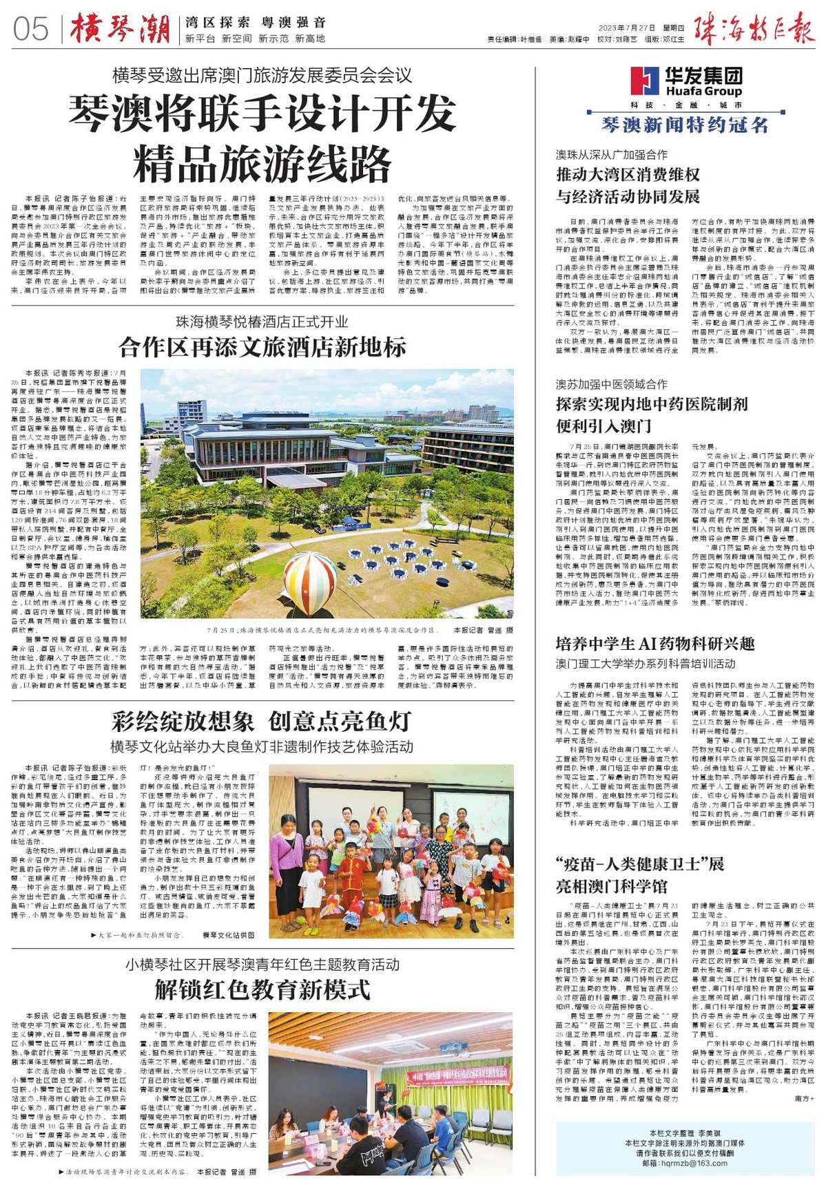 为加强琴澳在文旅产业方面的融合发展,合作区经济发展局将深入推进琴澳文旅融合发展,联手澳门围绕“一程多站”设计开发精品旅游线路。今年下半年,合作区将举办澳门国际美食节(横琴站)、水舞光影秀和中国-葡语国家文化周等特色文旅活动,巩固并拓宽琴澳联动的文旅客源市场,共同打造“琴澳游”品牌。
