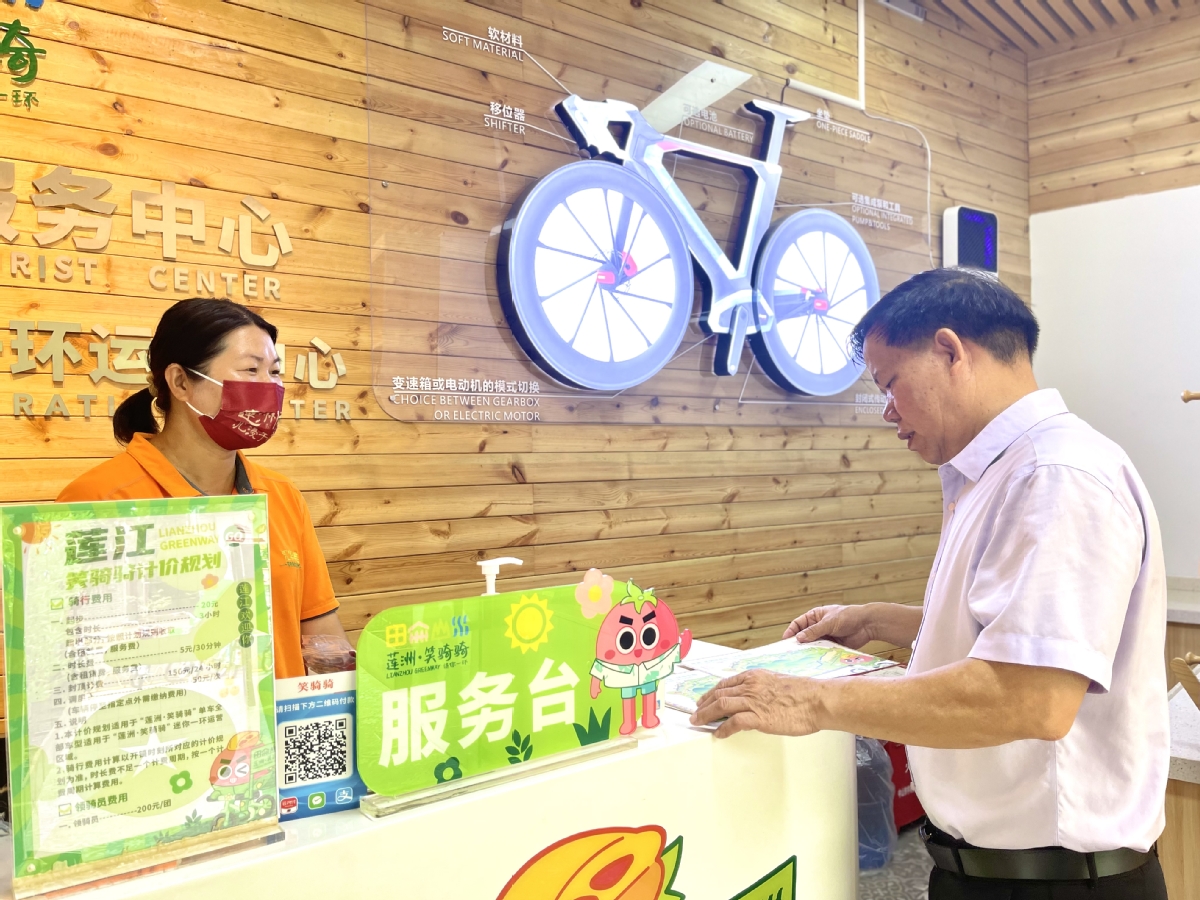 “这是港澳旅游团 有63人,一定要安排好 ‘一家一品’产品要跟得上。”一大早,邓昔强就来到莲江村“笑骑骑”单车驿站,了解当天游客接待情况,提醒工作人员要注意的事项。