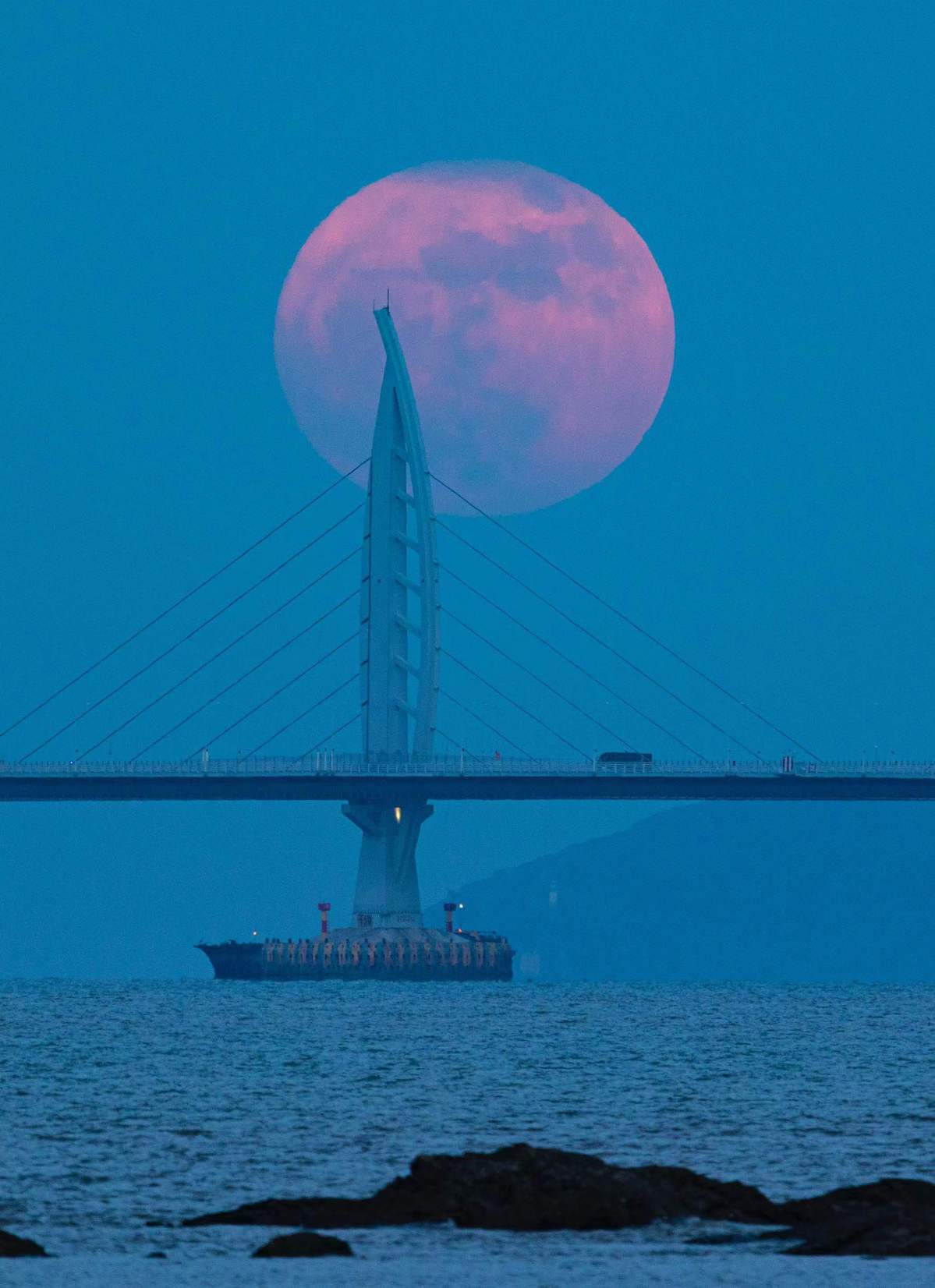 8月1日傍晚,一轮满月爬上港珠澳大桥。星斗月移,港车北上迎来满月。本年度第二大满月也同期上演。珠海传媒集团 李建束/摄