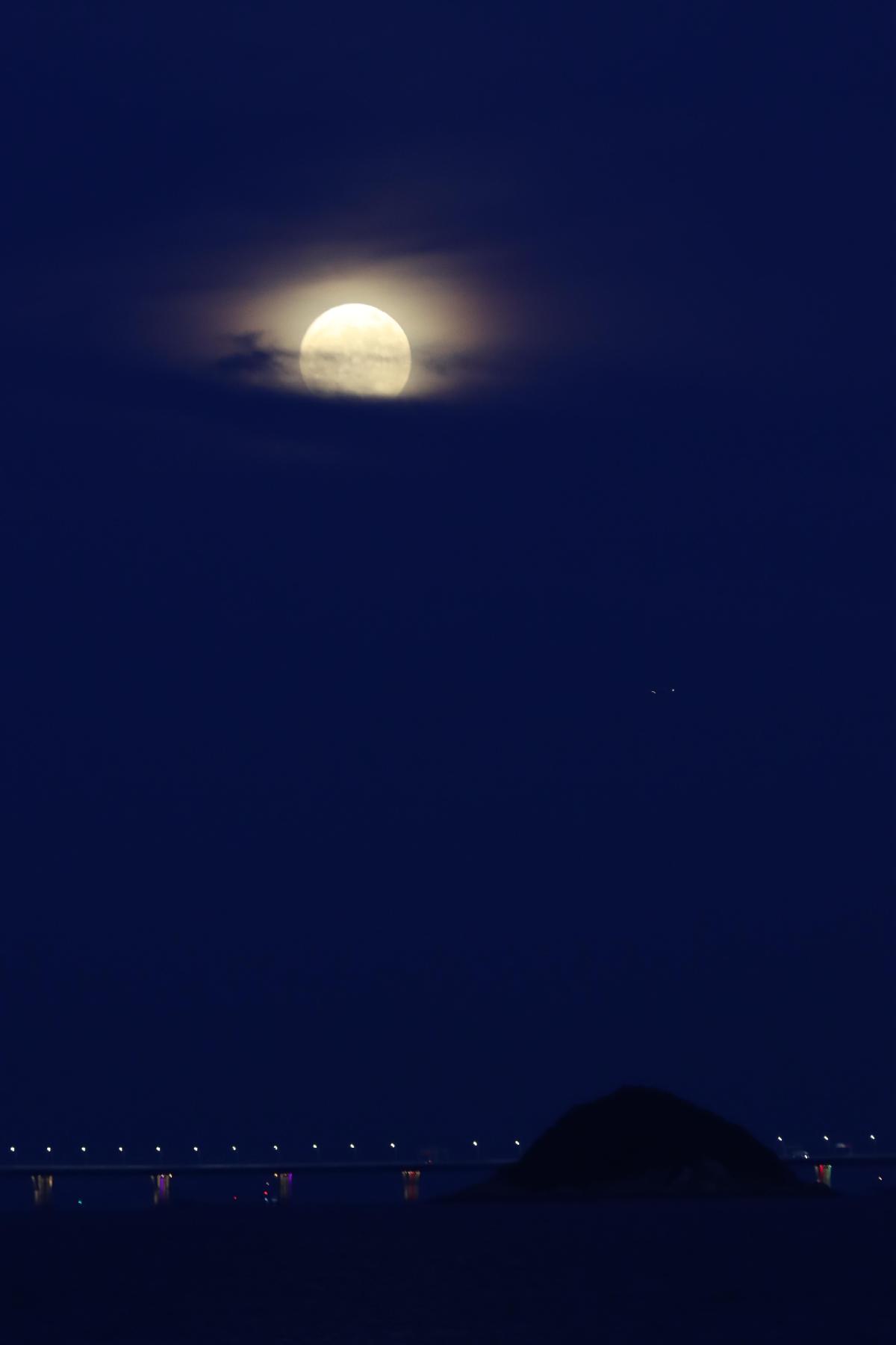 8月1日晚,香洲。海燕桥上看东南方海面,图为海上升明月,圆月透出云层,与海岛相映。珠海传媒集团 钟凡/摄