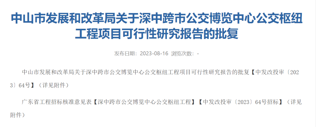 8月16日,中山市发展和改革局发布文件,“深中跨市公交博览中心公交枢纽工程”获批建设。