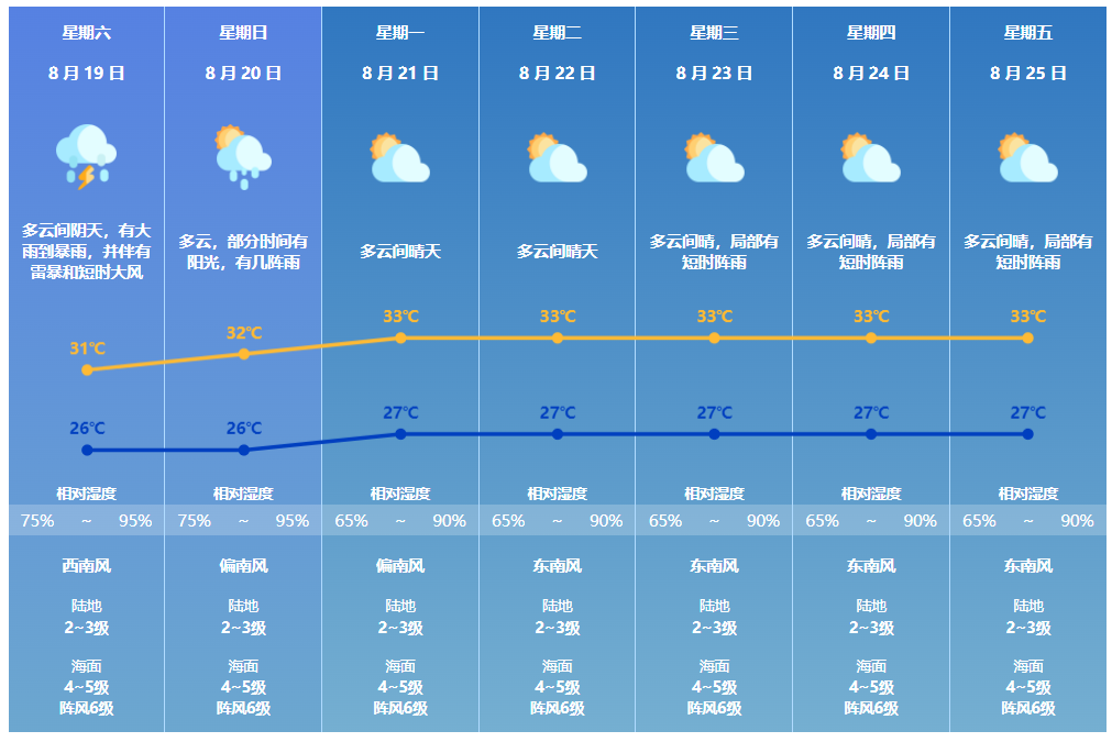 预计今早到夜间,珠海多云间阴天,有大雨到暴雨,并伴有雷暴和短时大风,气温26到31℃,相对湿度75%到95%,吹西南风,陆地风力2到3级,海面风力4到5级阵风6级。
