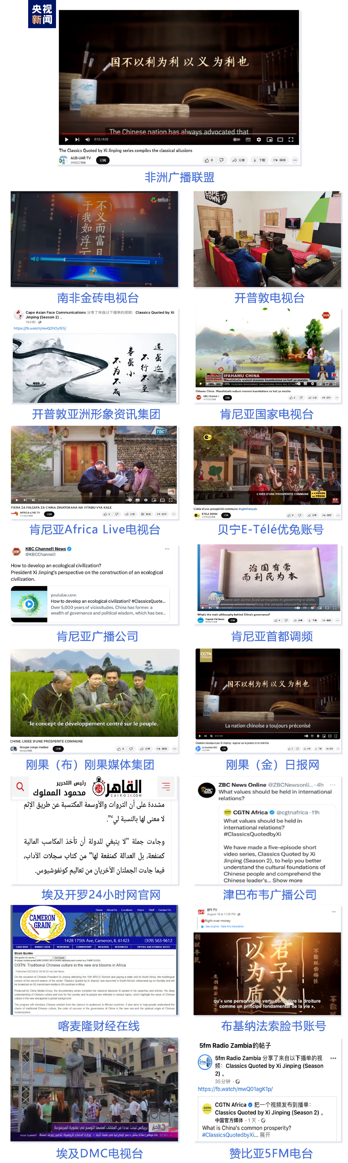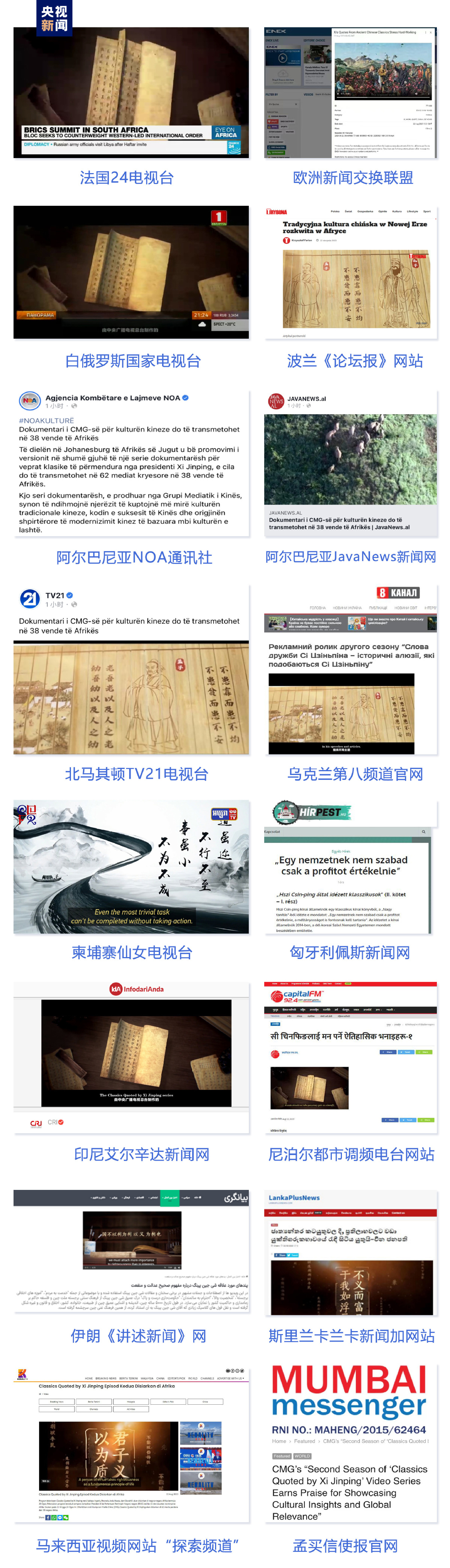 法国24电视台、欧洲新闻交换联盟、白俄罗斯国家电视台、波兰《论坛报》网站、阿尔巴尼亚NOA通讯社、北马其顿TV21电视台、乌克兰第八频道官网、匈牙利佩斯新闻网、柬埔寨东盟头条新闻社、缅甸仰光传媒、印尼艾尔辛达新闻网、尼泊尔都市调频电台网站等102家海外主流媒体纷纷转播转载《平“语”近人——习近平喜欢的典故》第二季多语种版本。