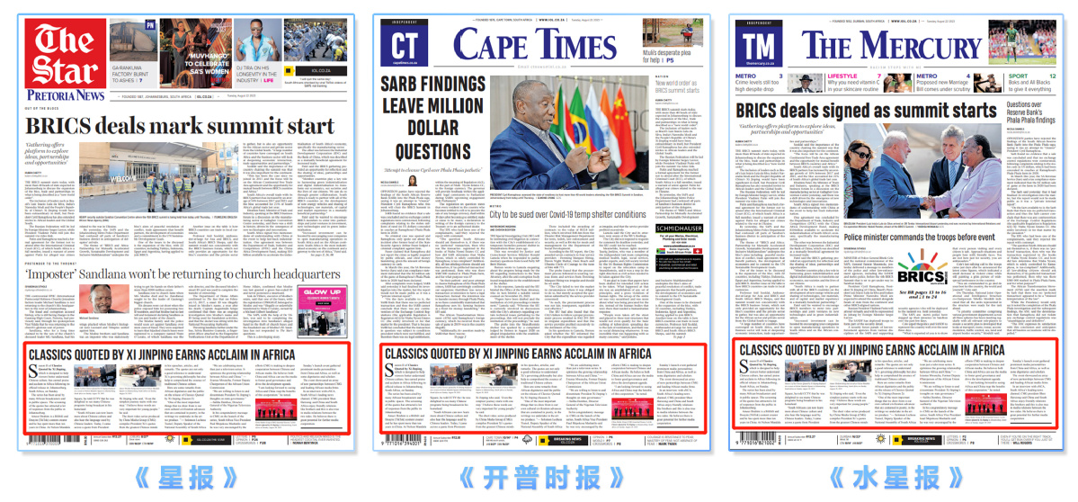 8月22日出版的南非三大主流报刊南非《星报》、《开普时报》、《水星报》,连续第二天在头版显著位置发表文章。文章指出,《平“语”近人——习近平喜欢的典故》第二季周日(8月20日)在南非约翰内斯堡正式发布后,在非洲赢得了广泛好评。系列节目已经在多家非洲广播公司播出,并在公共场所大屏幕展示,这些语录吸引了大量非洲受众观看并获得积极反响。