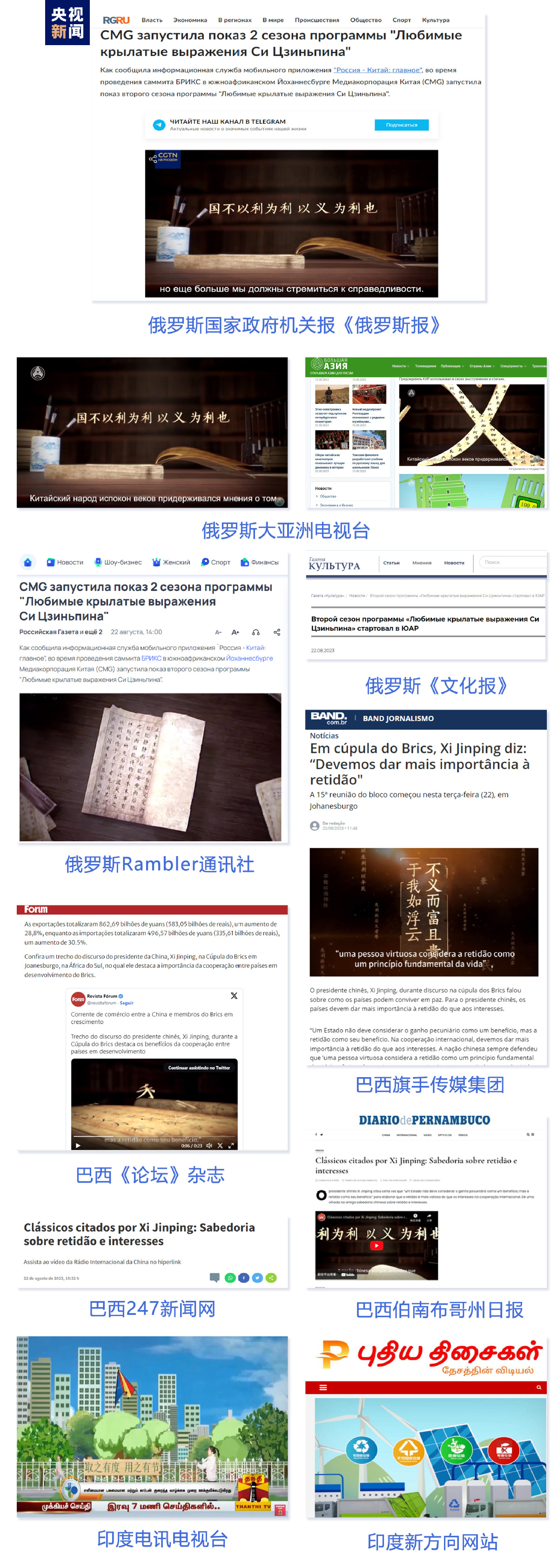 正值金砖国家领导人第十五次会晤在南非举行,《平“语”近人——习近平喜欢的典故》第二季俄语、葡萄牙语、印地语、泰米尔语等版本同步在巴西、俄罗斯、印度等金砖国家落地播出。俄罗斯国家政府机关报《俄罗斯报》、俄罗斯大亚洲电视台、俄罗斯Rambler通讯社、俄罗斯《文化报》、巴西旗手传媒集团、巴西《论坛》杂志、巴西伯南布哥州日报、巴西247新闻网、孟买信使报、印度新方向网站等金砖国家主流媒体纷纷转发转载。