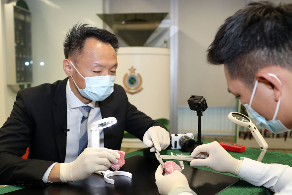 刘玉龙和同事戴着口罩和手套,用放大镜对准一块玉石细细察看纹理,并对着光线反复观察;桌面上,一台特制的微型摄像机无声地摄录着,红色指示灯一闪一闪。