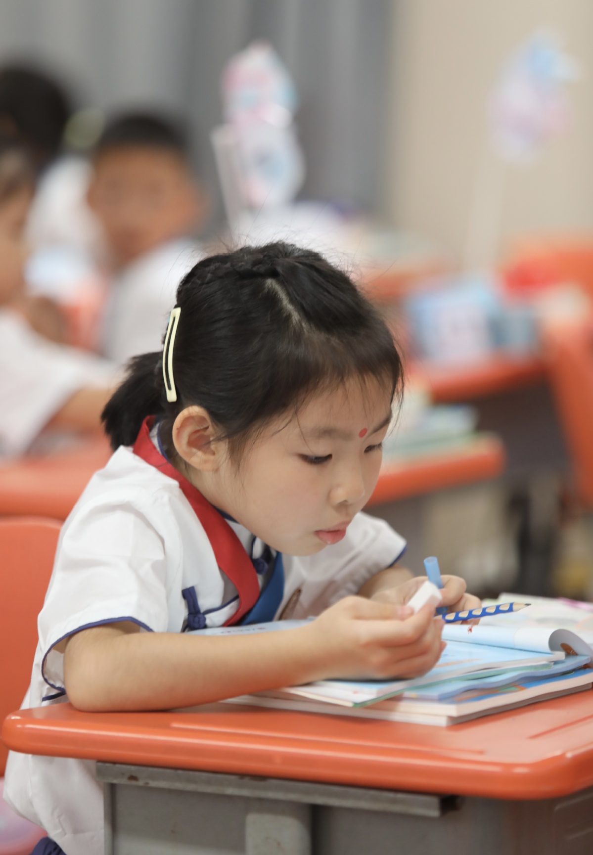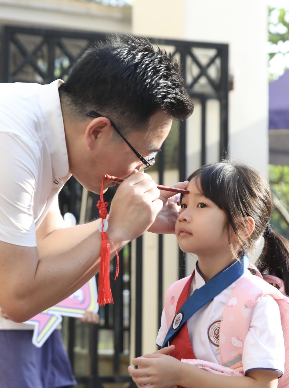 早上七点半左右,横琴第一小学学生陆续开始来到学校。今年的一年级新生和家长来到校门口时,由家长为孩子系上红蓝绶带(蓝色代表纯净和勇气,红色代表热情和好运),系上美好的祝福,牵手步入校门,家长将孩子送到校长面前,校长为孩子点朱砂、启智慧。随后孩子行至大鼓前,击鼓鸣志,再来到班主任老师面前,老师为孩子赠书,师生相互鞠躬行礼。插班生和其他同学,进入学校击鼓鸣志之后在新学期主题板上签名立志,随后进入教室写下自己的学习目标,张贴于班级学期目标栏上,为新学期喝彩。