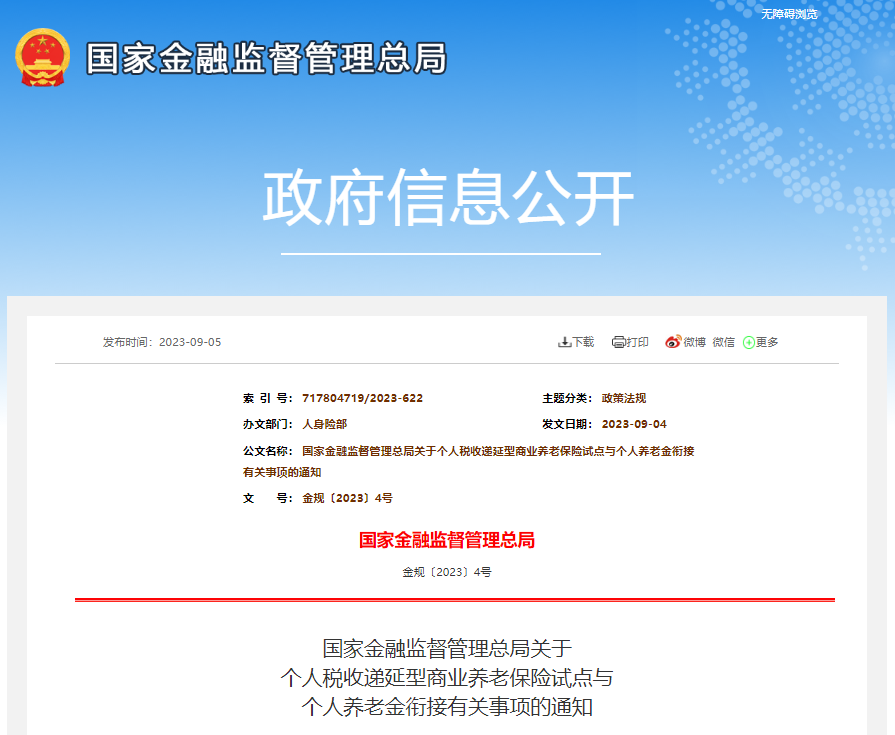 为贯彻落实《国务院办公厅关于推动个人养老金发展的意见》(国办发〔2022〕7号)以及《个人养老金实施办法》(人社部发〔2022〕70号)、《中国银保监会关于保险公司开展个人养老金业务有关事项的通知》(银保监规〔2022〕17号)等要求,促进个人养老金业务健康有序发展,经商财政部、人力资源社会保障部和税务总局,金融监管总局决定开展个人税收递延型商业养老保险(以下简称个税递延型养老保险)试点与个人养老金衔接工作,现就有关事项通知如下: