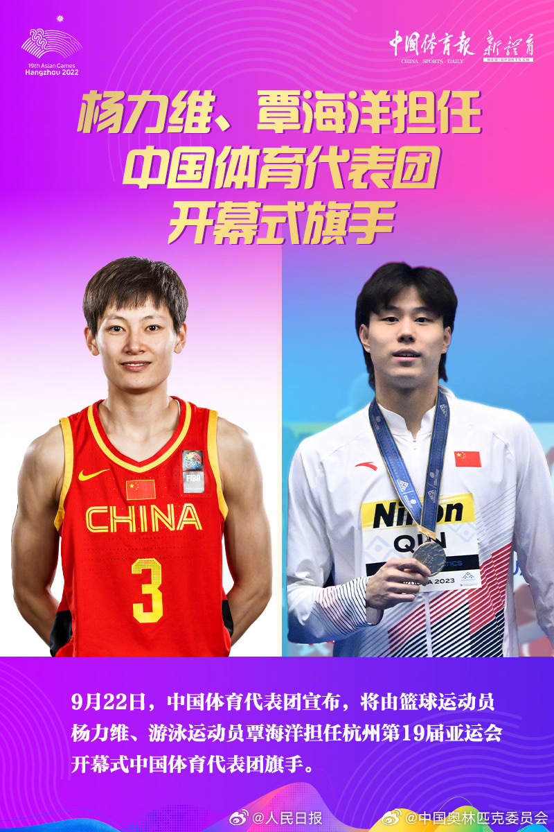 9月22日上午,中国体育代表团宣布,将由游泳运动员覃海洋和篮球运动员杨力维担任杭州亚运会开幕式中国体育代表团旗手。