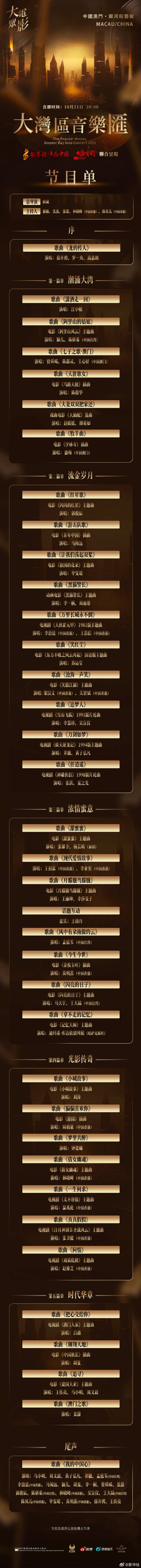 大众电影2023大湾区音乐汇节目单正式发布!徜徉在时光长河中的经典之作,不会任岁月磨灭光泽,它们在传唱中被赋予新的生命,迸发出耀眼的光芒。今晚8点,来@新华社 直播间,看一场如梦似幻的音乐之旅!一起期待!