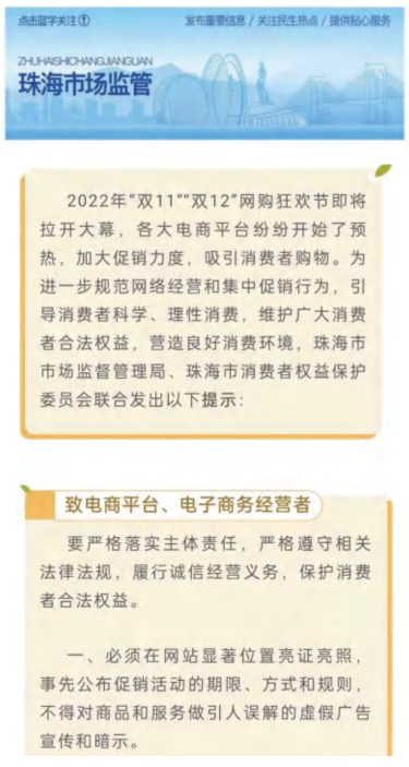珠海市市场监督管理局、珠海市消费者权益保护委员会联合发布“ 双11”“双12”网购狂欢节消费警示。