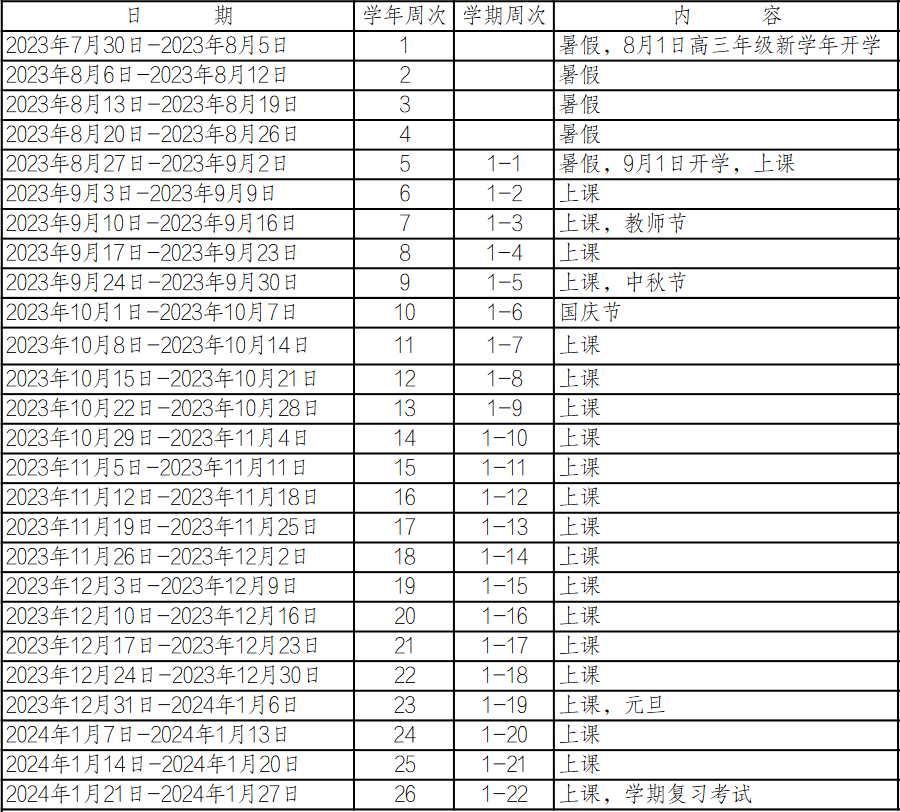 寒暑假、国家法定假日11周。寒假起始时间为2024年1月28日,暑假起始时间为2024年7月14日。法定节假日,执行国务院、省政府规定。