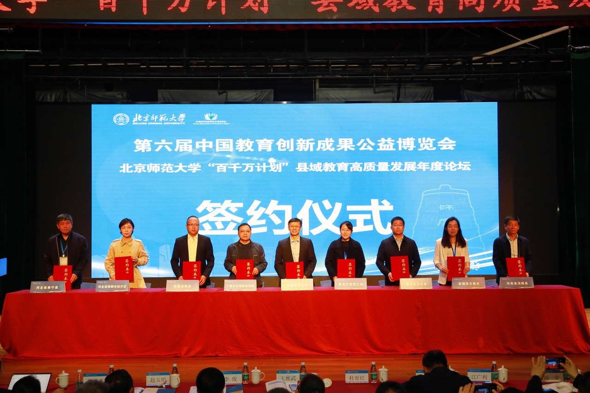 论坛期间,多位嘉宾进行了主旨报告,河北、内蒙古、黑龙江、河南、广西、贵州、新疆等地的12个市、区、县与北京师范大学签署合作协议加入“百千万计划”;来自高校、地方教育行政部门、教研机构、中小学校和公益组织的一批专家学者获聘为“百千万计划”项目首批专家;与会嘉宾共同启动了“百千万计划”京师名家百县行活动,同时,该计划获得两家支持单位的慷慨捐赠。此外,与会者参加了教博会开幕式和“强师论坛”,聆听了多位专家围绕“县域教育高质量发展”进行的主旨报告,开展了圆桌论坛“县域教育治理”主题交流等多项活动。