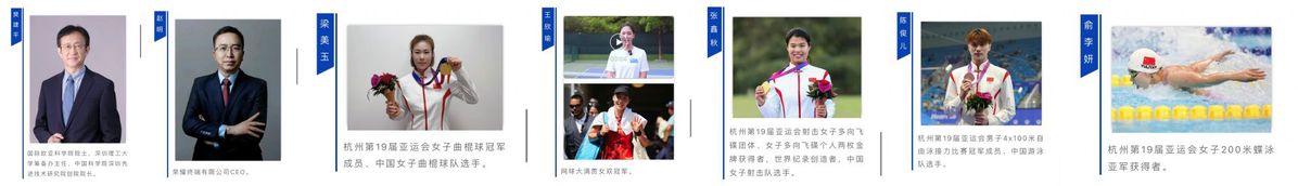 樊建平(国际欧亚科学院院士,深圳理工大学筹备办主任,中国科学院深圳先进技术研究院创院院长)、赵明(荣耀终端有限公司CEO)、梁美玉(杭州第19届亚运会女子曲棍球冠军成员、中国女子曲棍球队选手)、王欣瑜(网球大满贯女双冠军)、张鑫秋(杭州第19届亚运会射击女子多向飞碟团体、女子多向飞碟个人两枚金牌获得者,世界纪录创造者,中国女子射击队选手)、陈俊儿(杭州第19届亚运会男子4x100米自由泳接力比赛冠军成员、中国游泳队选手)、俞李妍(杭州第19届亚运会女子200米蝶泳亚军获得者)。