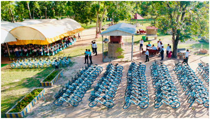 当地时间11月24日上午,在柬埔寨磅清扬省切克坎德小学(Chhork Kandal Primary School)举办柬埔寨爱心单车项目首场发放仪式。柬埔寨磅清扬省副省长Yang Phirum先生、磅清扬省教育局局长Seum Brem先生、柬埔寨民间社会组织联盟论坛秘书长Pay Sambo先生、中国乡村发展基金会项目工作人员、项目受益学生、项目受益学生家长、学校教师等150余人参加本次发放活动。