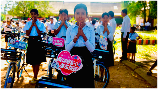 12岁的柬埔寨女孩洪拉莎(Hong Raksa)就是受赠的其中一名小学生,此前她每天上学需要步行3公里花30分钟才能到达校园,拿到单车后洪拉莎骑上单车从学校到家里,只用了6分钟,她的母亲说:“以后我们再也不用那么辛苦了!”。这辆来自中国的“爱心自行车”改变了洪拉莎多年来风雨无阻的徒步求学之路。