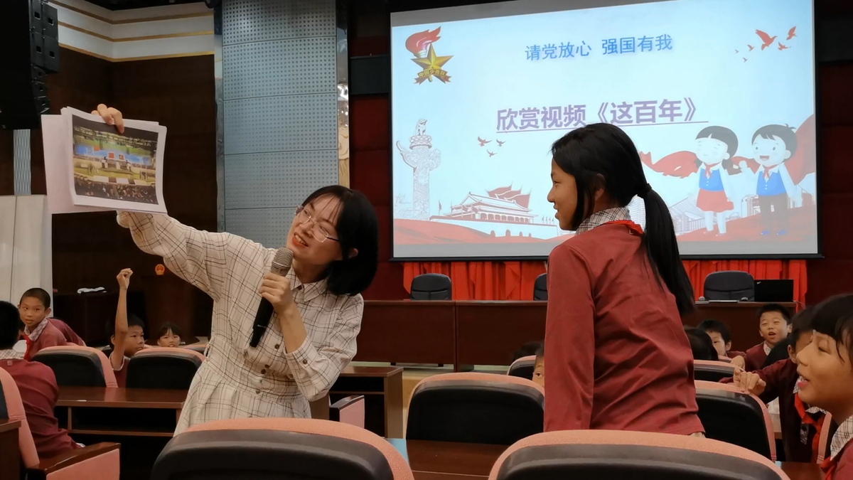 在活动现场,蔡雪冰深情讲述了中国共产党的光辉历程,重温了革命先烈的英勇事迹。她引导学生们理解“请党放心,强国有我”的深刻含义,激励他们珍惜当下的幸福生活,努力学习,为祖国强大贡献自己的力量。海岛少年们积极参与互动,在诵读活动中用自己的满腔热情歌颂祖国母亲的伟大,抒发着身为中国人的骄傲和自豪,充分展现出积极进取、奋发向上的少年风采。