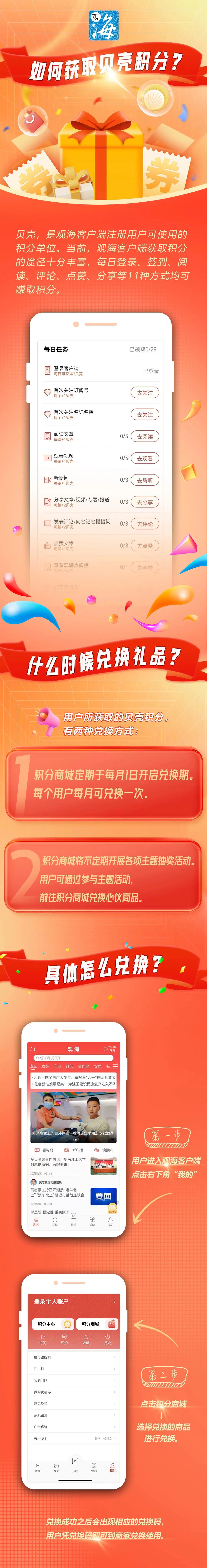 今年观海客户端正式上线积分中心、积分商城,用户下载或更新观海新版本后,通过登录、签到、阅读等操作便可以赚取贝壳积分,用贝壳即可在积分商城免费兑换心仪的礼品。