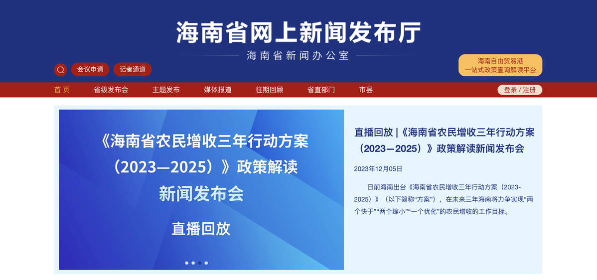 该平台还设有“记者通道”,为媒体记者提供在线报名、提问征集等功能;设有“海南自贸港一站式政策查询解读平台”入口,供用户一键跳转查询。目前,该平台已同步入驻“海南发布”融媒体矩阵,将进一步拓宽其传播渠道和覆盖面,构建线上线下一体、内宣外宣联动的宣传格局,为社会公众和媒体记者提供便捷高效的信息服务。