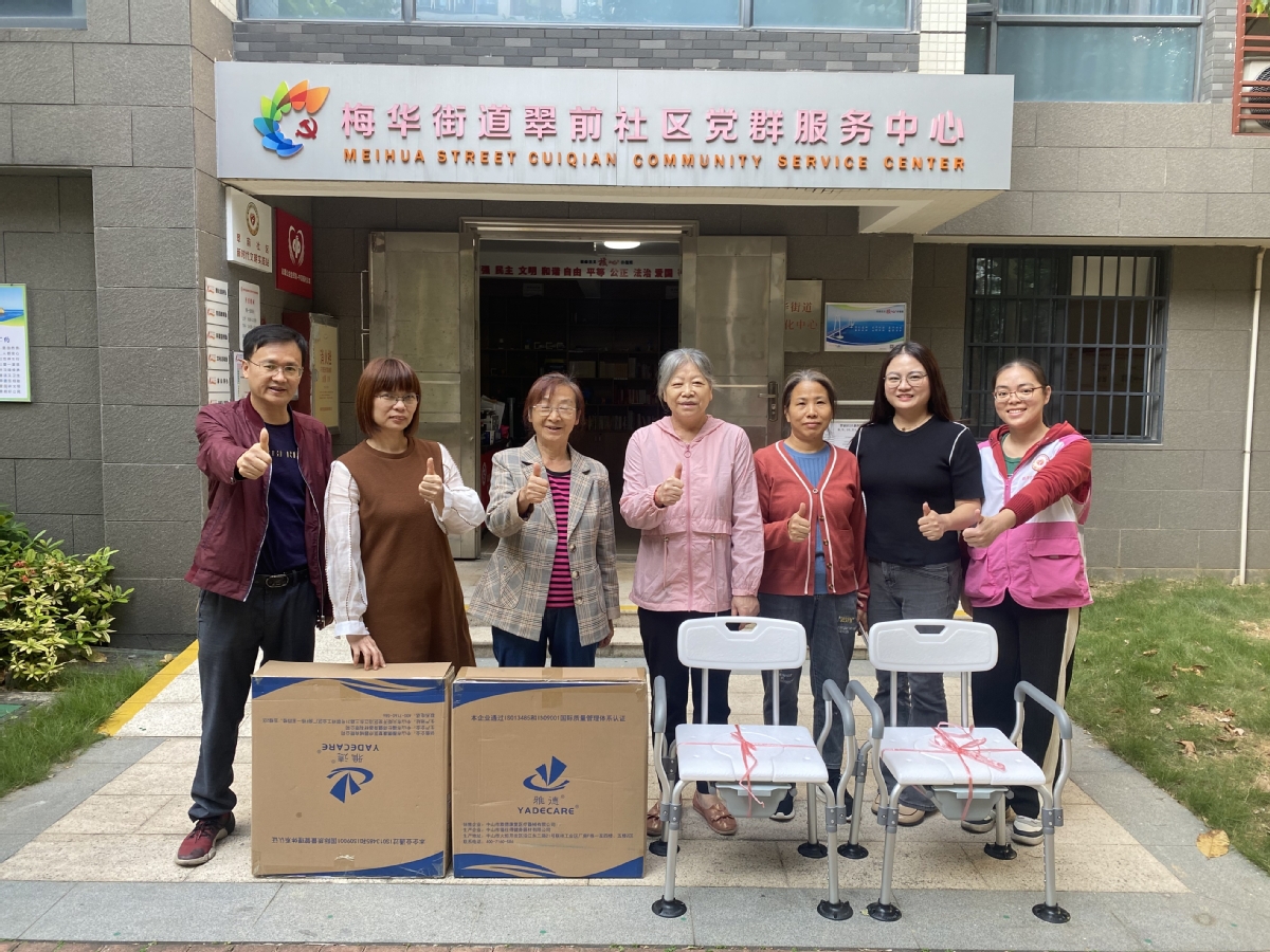 梅华街道和翠前社区工作人员还相继给葵花园小区的赵姨、夏叔、付姨等老人家送上了洗澡凳。