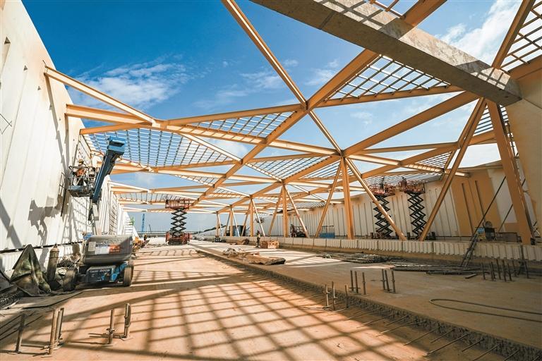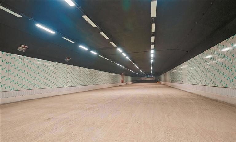 建设者们将暗挖隧道段的设计与区域规划紧密配合,在隧道出入口采用钢结构框架,顶部镶嵌小块密集的钢结构,装上吸声板,其余处则直接镂空。当日光自然投射进隧道,就会形成星星点点的光亮,实现“引景入城”的空间效果。冯金告诉记者,这种创新设计不仅在视觉上更加美观,还能帮助司机在行车时更好地适应明暗光线变化,提高驾驶安全性。