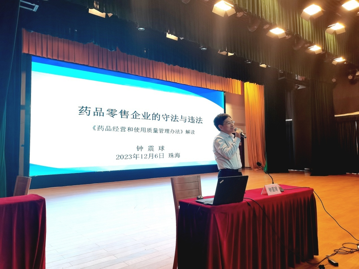 本次培训还特邀原韶关市市场监管局四级调研员、前国家级药品GSP检查员、药品安全领域专家钟震球给参训人员授课,重点讲解了《中华人民共和国药品管理法》《药品经营和使用质量监督管理办法》等法律法规,并结合国家对药品经营相关管理要求、药品经营企业违法行为分析等内容进行案例教学。