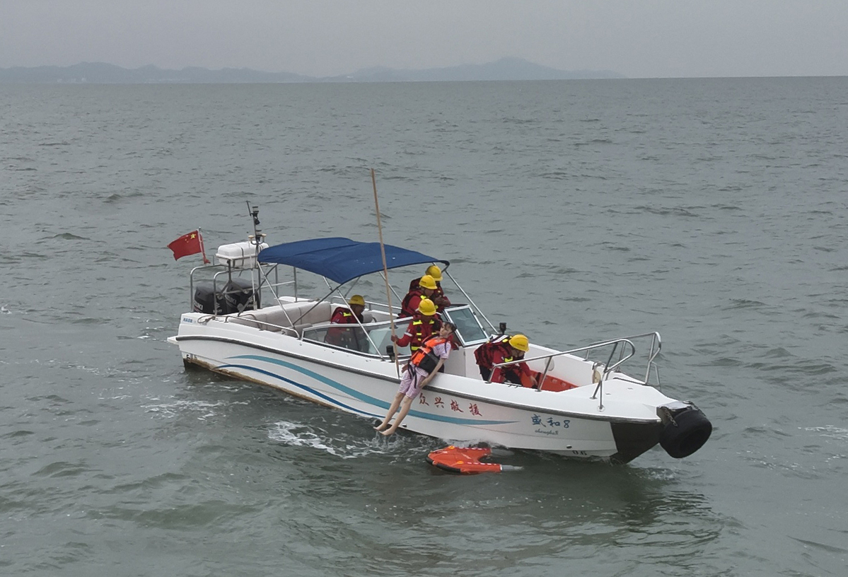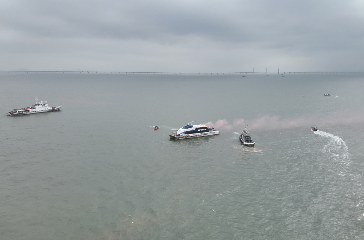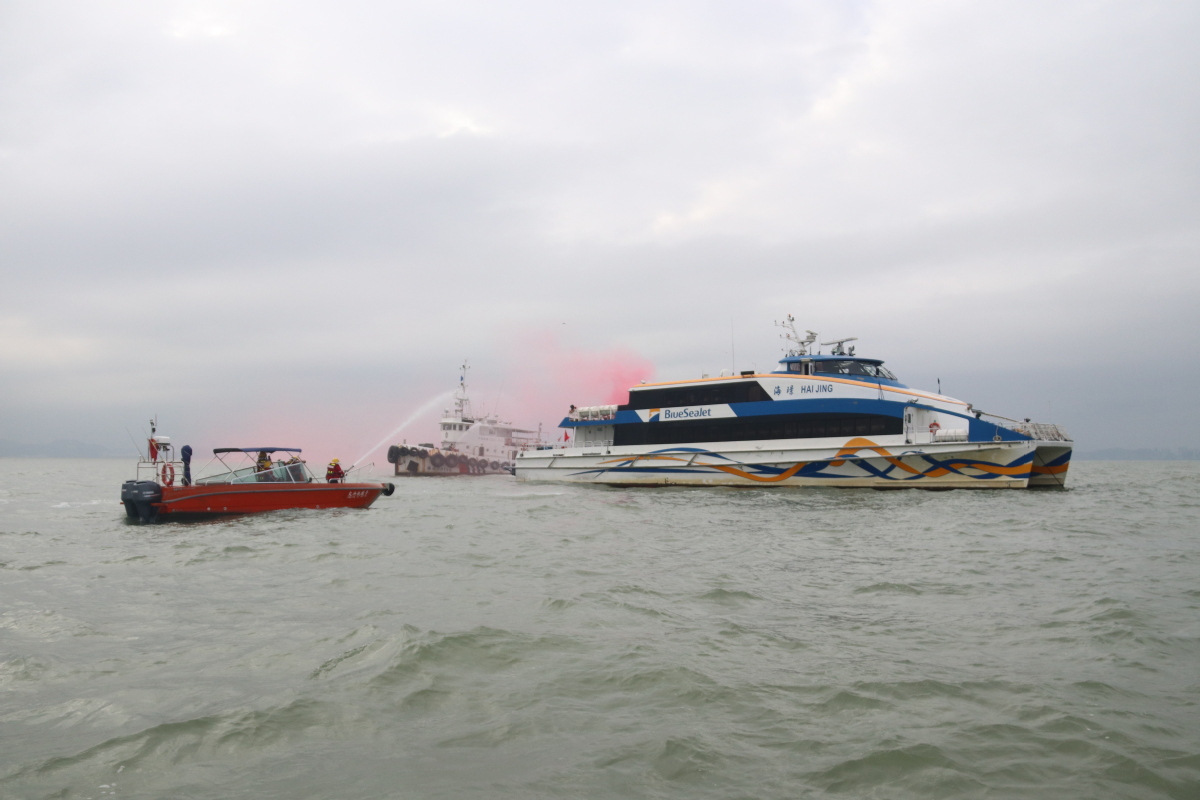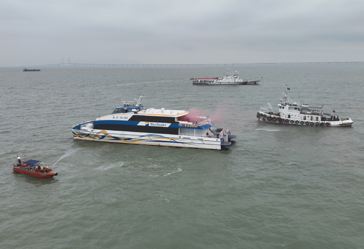 演习模拟一艘旅游客轮在珠海香洲港对开水域机舱起火,失去动力漂航,乘客及船员急需救助,4人意外坠海且其中1人重伤,需立刻进行海上搜救并送医治疗的场景。