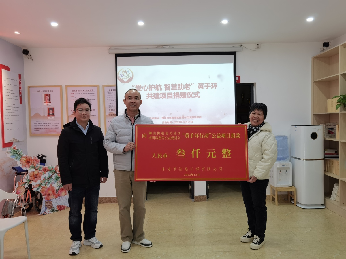 该项目常年在狮山街道南美社区党群连心亭(南坑市场旁)设立固定宣传发放点,截至目前已累计为600多位老人提供帮助,并协助找回多名走失老人。在相关部门的引荐下,爱心单位珠海市信息工程有限公司关注到南美社区黄手环助老活动,主动提出捐赠善款3000元用于购买黄手环。捐赠现场,该公司负责人表示:“敬老爱老是中华民族的传统,我们希望小小的善举,可以带动社会去温暖更多的人。”