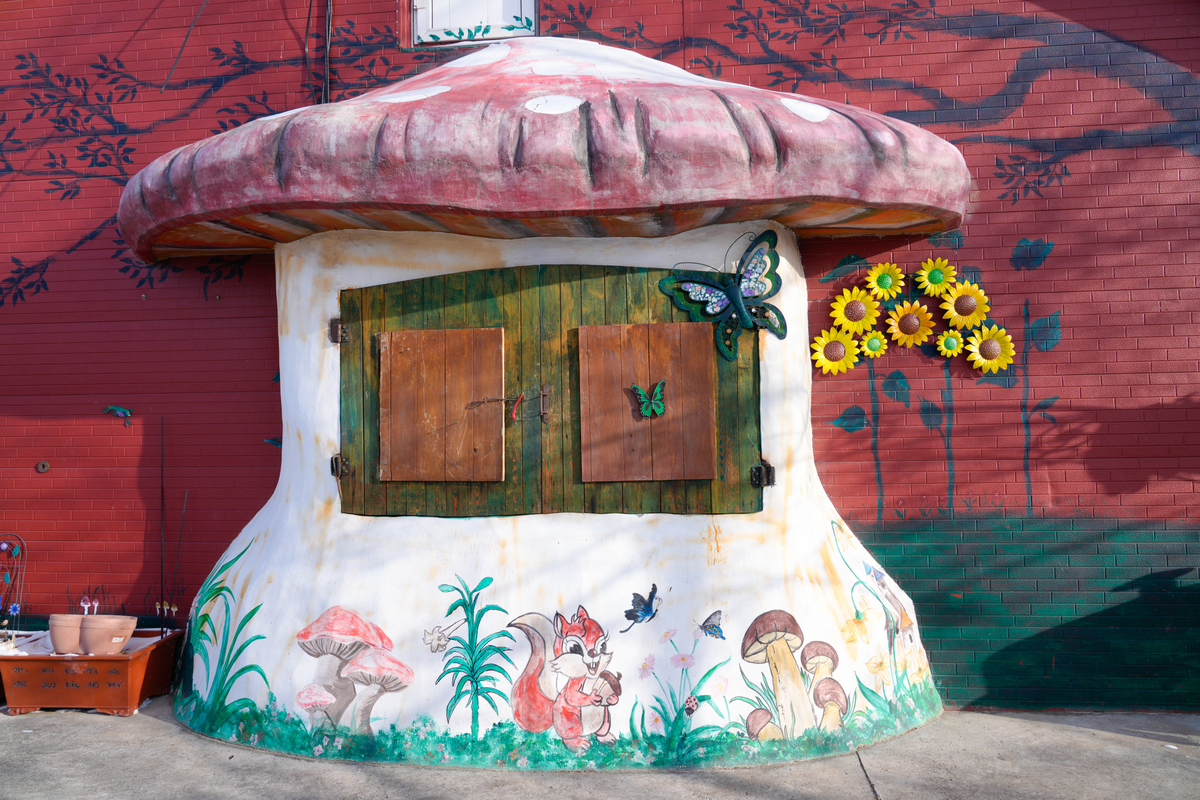 👇小院内处处巧思,蘑菇形状的窗户上缀满形态各异的蝴蝶。