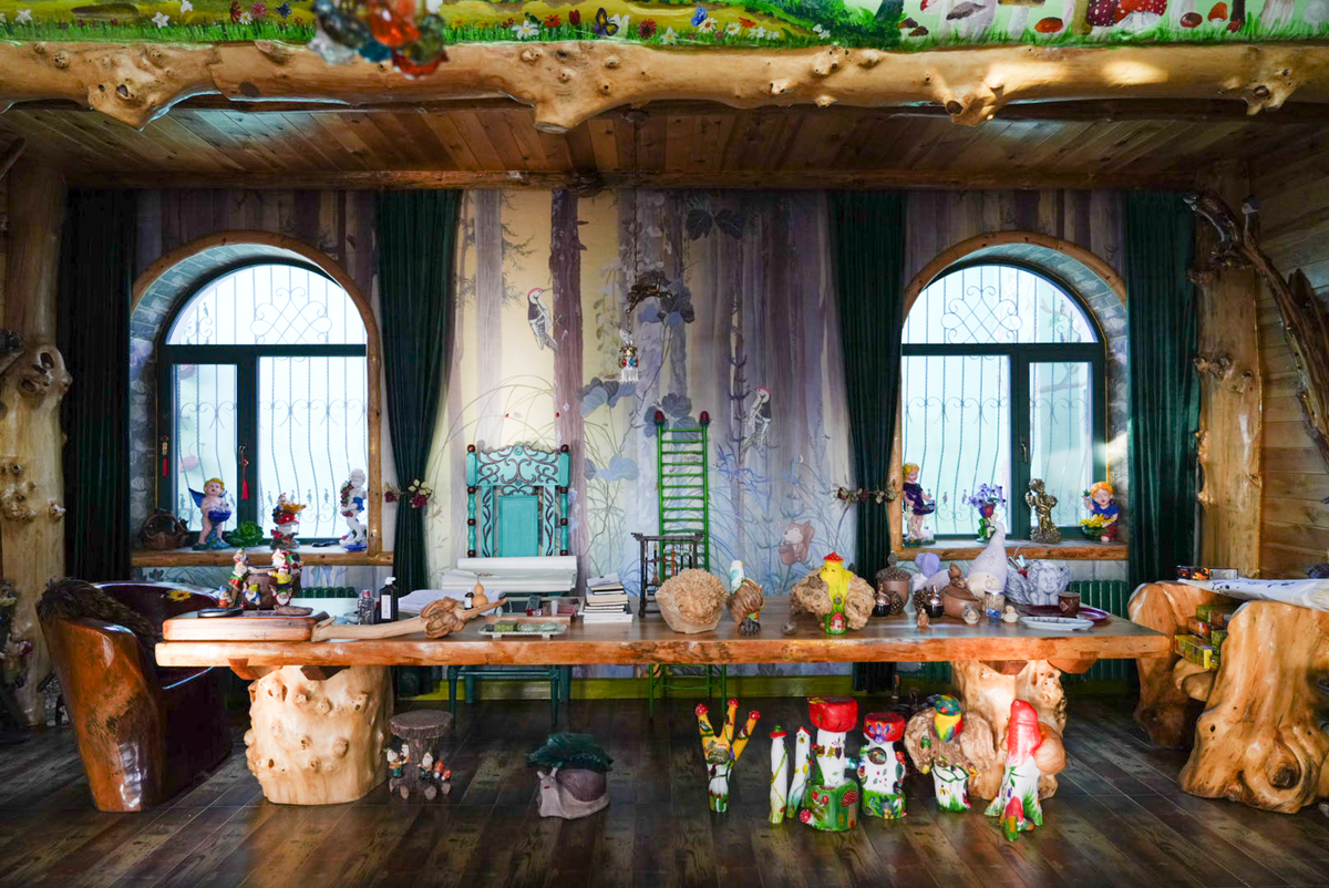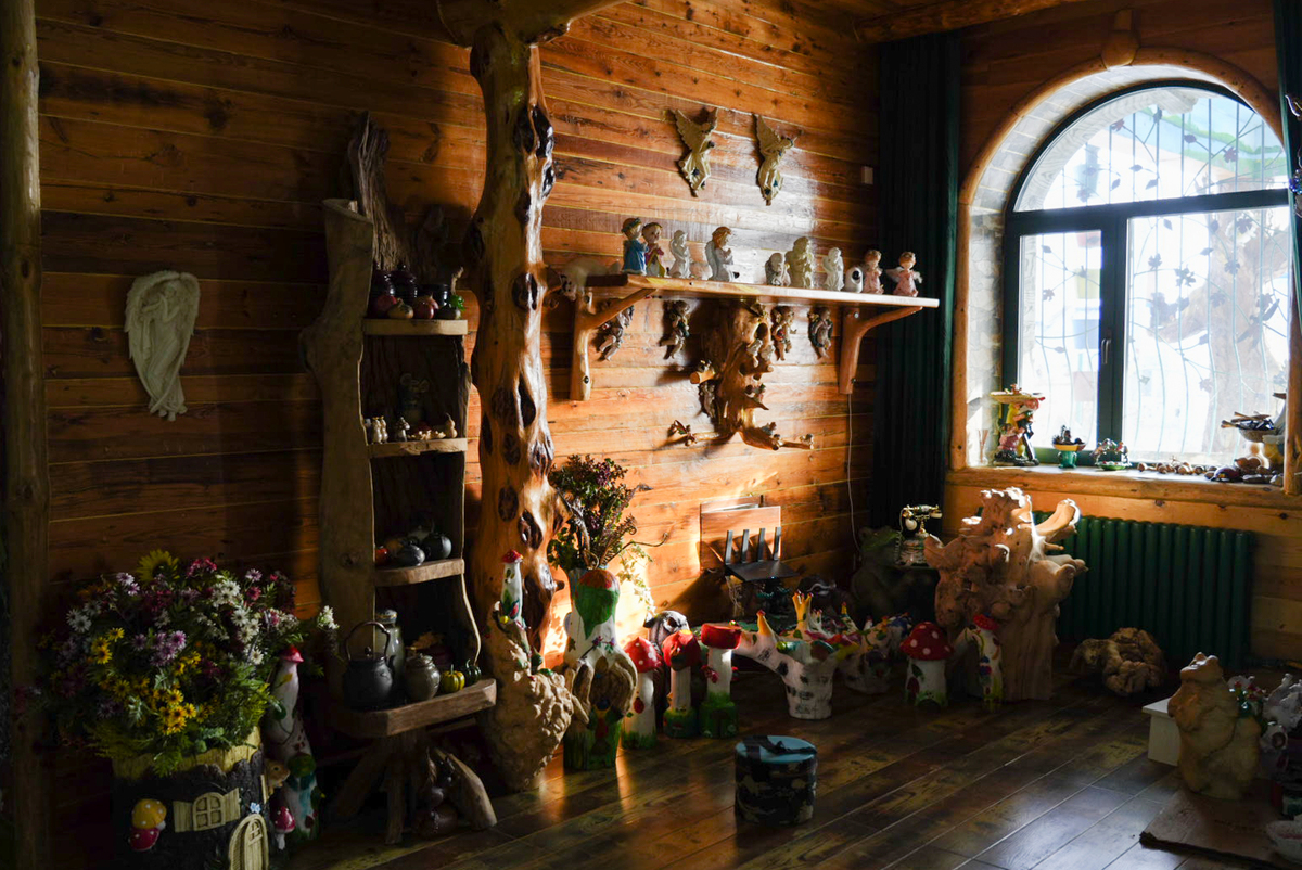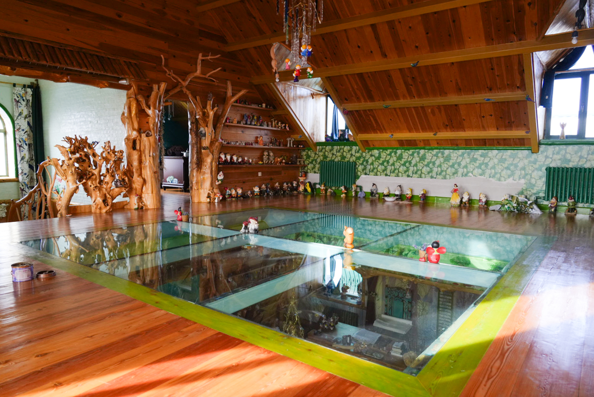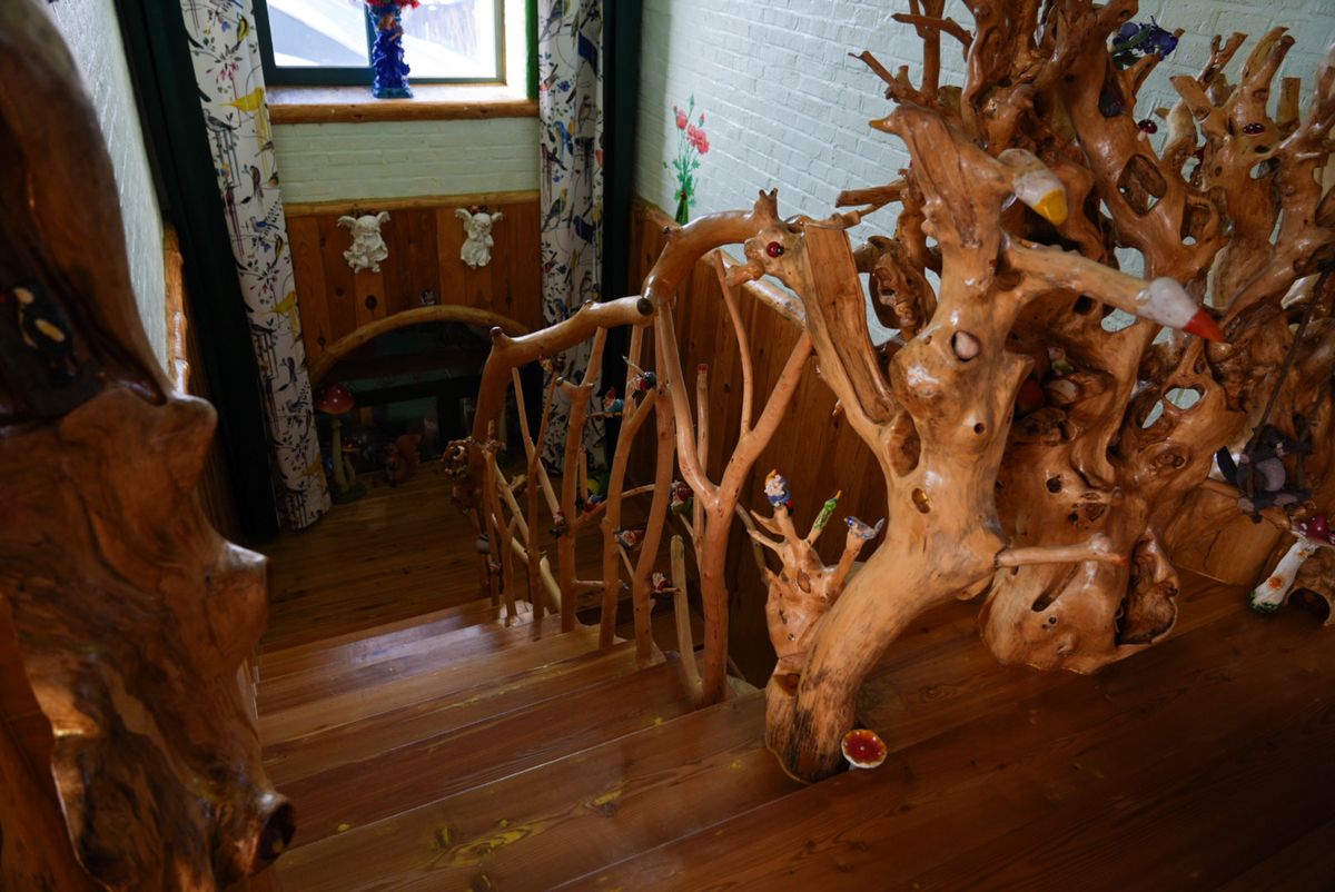 屋内更好似童话世界,房主自己雕刻的实木楼梯扶手上,爬着蜗牛、瓢虫和许多小矮人,好像下一秒就会开口讲话,近万个摆件都由房主人亲手制作、改造,让人眼花缭乱。