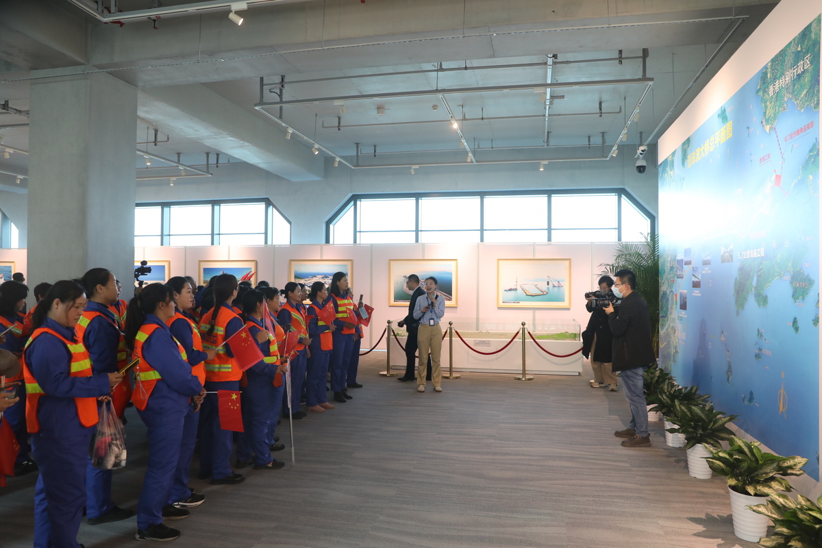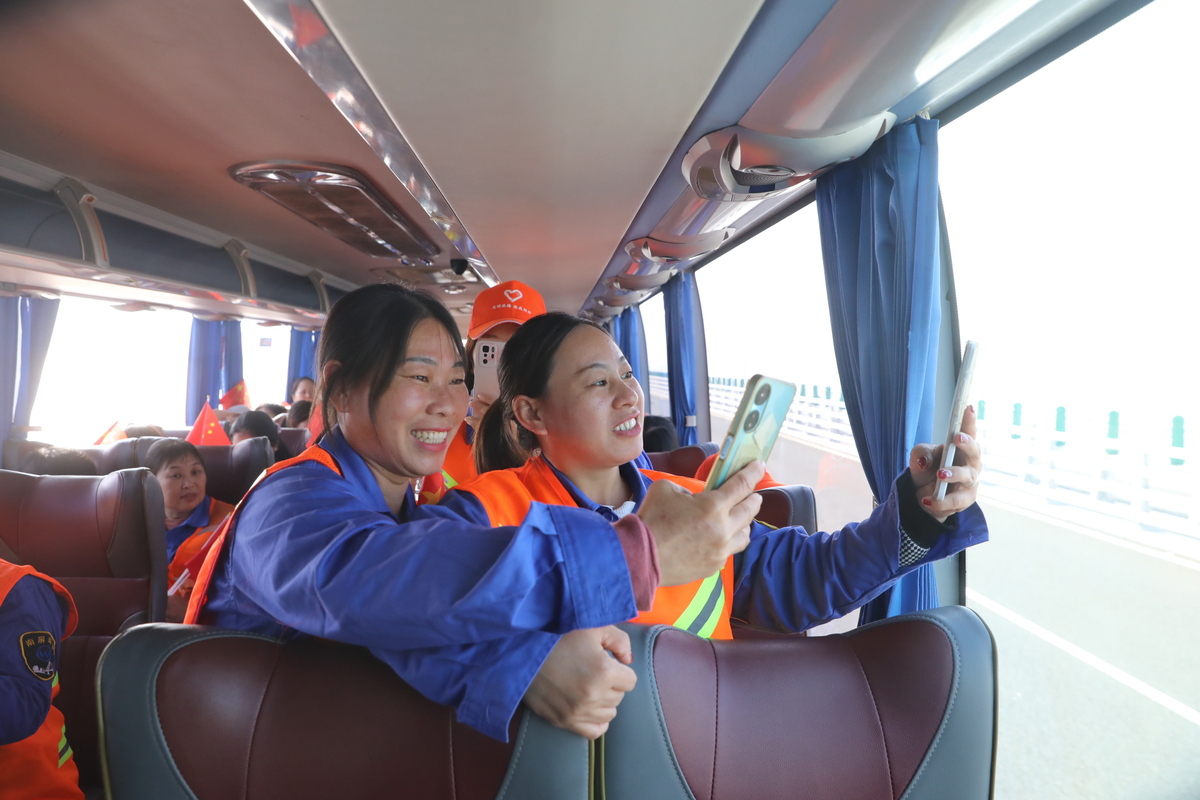 当天下午,3台大巴车承载着百名环卫女工行驶在港珠澳大桥,环卫女工抑制不住的兴奋和喜悦,一路欢歌笑语抵达蓝海豚岛。蓝天下,碧海间,大家“实地看大桥、亲身游大桥”,近距离欣赏伶仃洋的美景,领略国家工程、国之重器的雄姿和风采,亲身感知大桥建设成就,聆听大桥故事,共享改革开放成果。